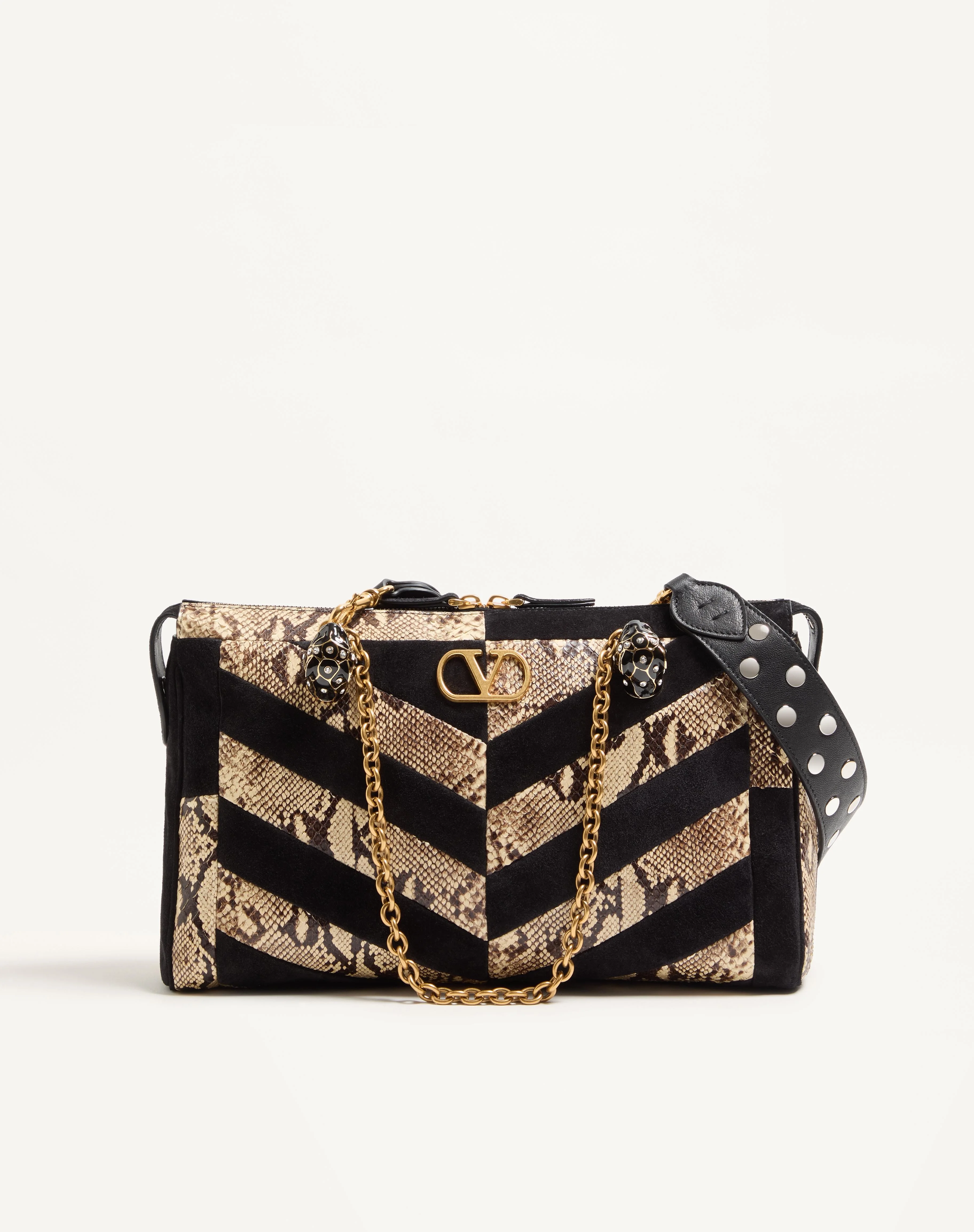 Valentino Garavani Panthea shoulder bag in python and suede patchwork with chevron motif. Bag features enameled feline heads adorned with Swarovski® crystals. The bag can be worn over the shoulder by the shoulder strap or carried by hand with the handles. - Antique gold-finish hardware - VLogo Signature metal detail in antique brass finish - Zipper closure and side buttons - Nappa lining. Interior: slip pocket and zippered pocket - Chain handles and adjustable and removable studded leather shoulder strap - Shoulder strap drop length: 28 cm / 11.0 in.; handle drop length: 18 cm / 7.1 in. - Dimensions: W33xH19.5xD9 cm / W13.0xH7.7xD3.5 in. - Made in Italy Product code: 7W0B0S70EGD_DMY