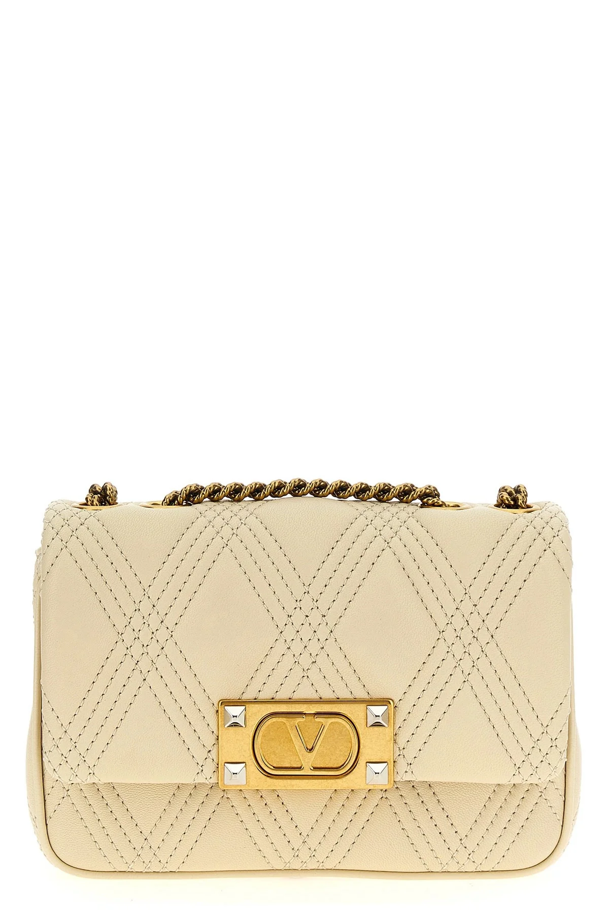 cod. W2B0R08XCAREN 'Quiltie 67' shoulder bag in quilted nappa leather, flap closure with metal 'VLogo Signature' detail with antiqued pressure finishes and studs, sliding chain shoulder strap. Color: White Size & Fit: W 19 x H 13 x D 6.5 cm Composition: 100% lamb leather (Ovis aries) Made in: Italy
