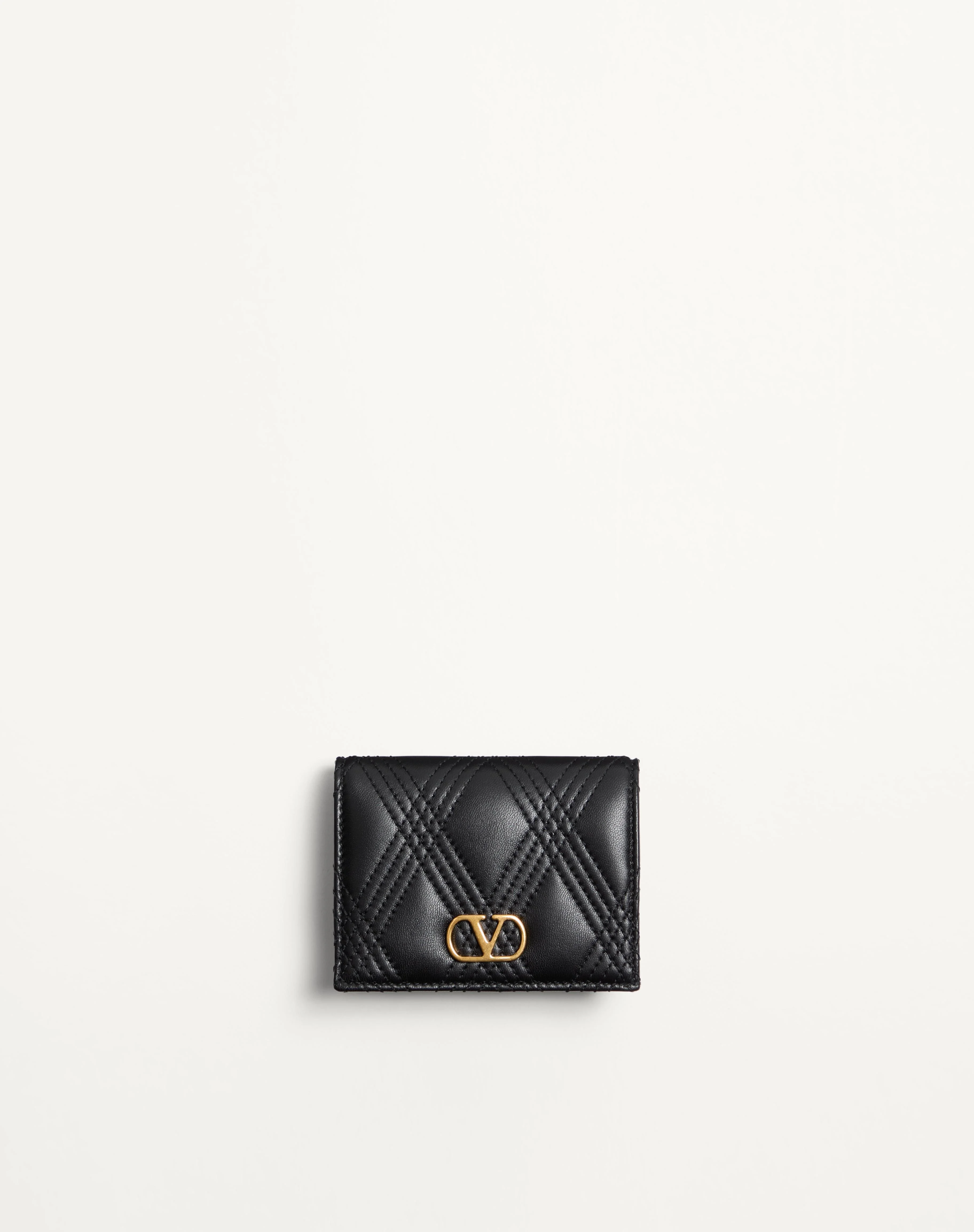 Valentino Garavani Quiltie 67 wallet in nappa leather. Quilted construction with diamond pattern outlined by tone-on-tone stitching. - Antique brass-finish logo and hardware - Snap button closure - Five card slots and one slip pocket - Zippered coin pocket and one bill pocket - Dimensions: W11.5xH8.5xD3 cm / W4.5xH3.3xD1.1 in. - Made in Italy Product code: 7W2P0AS4MIC_0NO