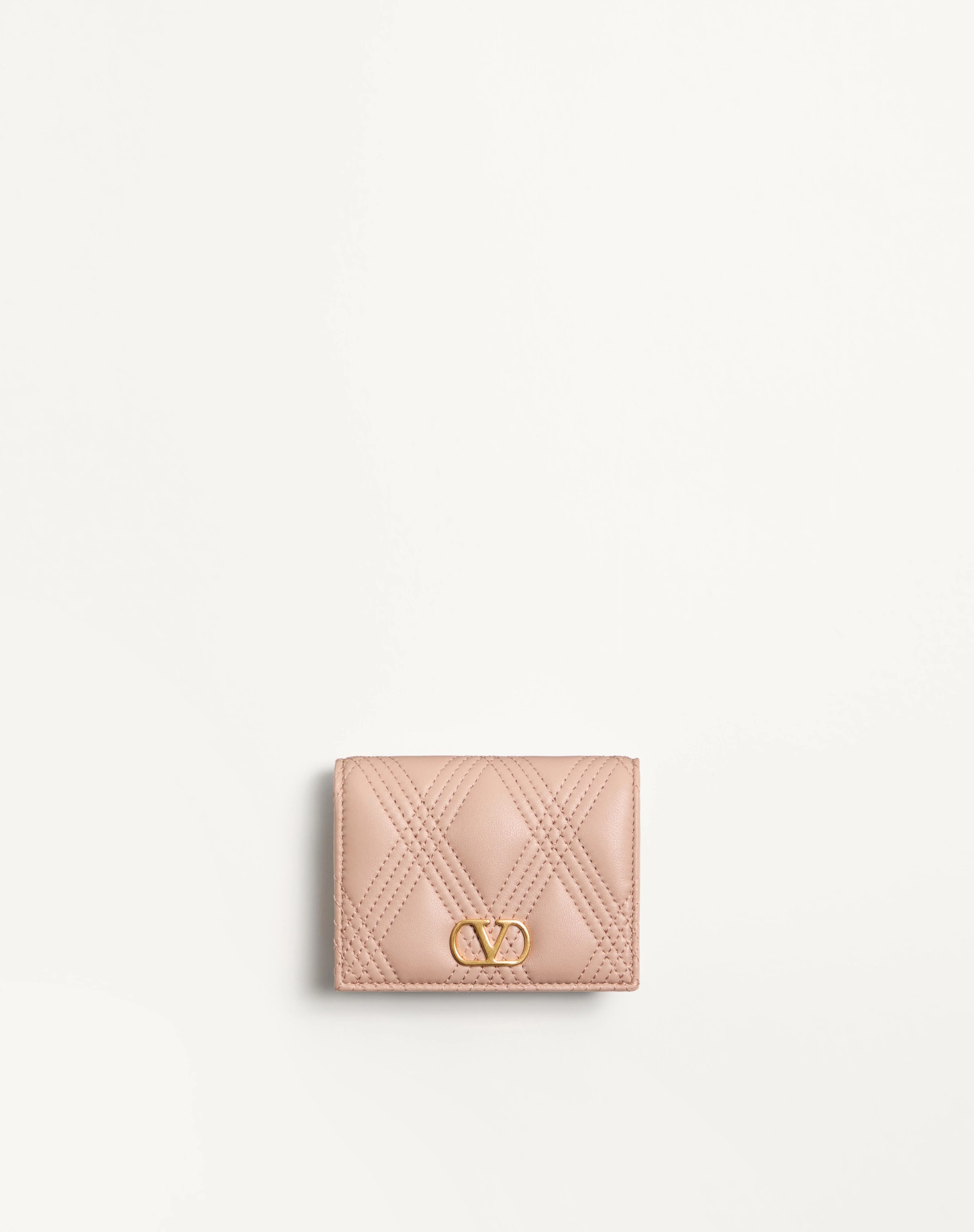 Valentino Garavani Quiltie 67 wallet in nappa leather. Quilted construction with diamond pattern outlined by tone-on-tone stitching. - Antique brass-finish logo and hardware - Snap button closure - Five card slots and one slip pocket - Zippered coin pocket and one bill pocket - Dimensions: W11.5xH8.5xD3 cm / W4.5xH3.3xD1.1 in. - Made in Italy Product code: 7W2P0AS4MIC_GF9