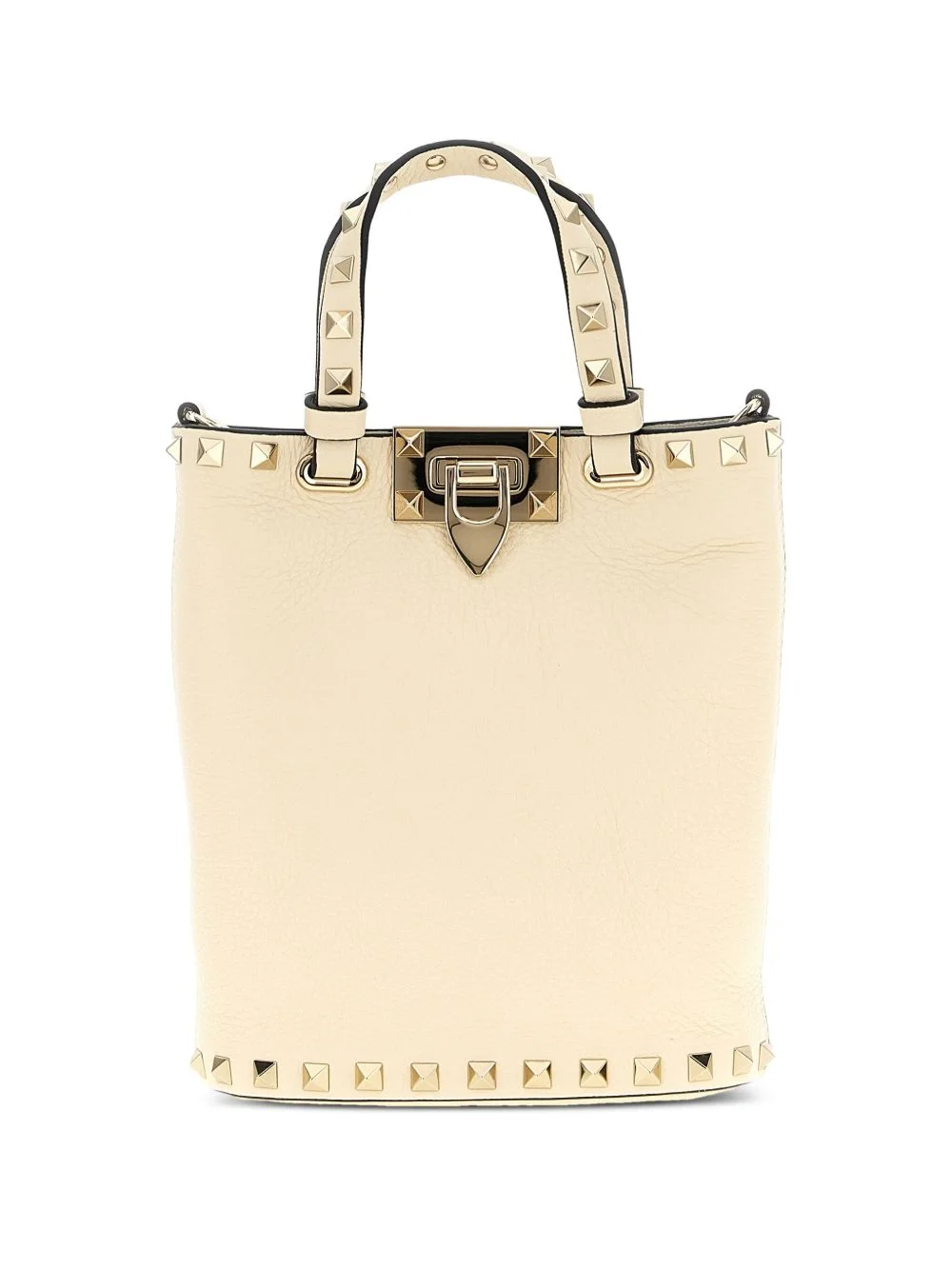 Rockstud leather mini tote bag Highlights - Valentino ready to wear - White - Leather - Rockstud embellishment - Double handle - Turn-lock closure - Adjustable and detachable shoulder strap Made in Italy Composition Outer: Leather 100% SIZE & FIT Measurement DEPTH 3.14 in(8 cm) HEIGHT 7.48 in(19 cm) WIDTH 7.08 in(18 cm)
