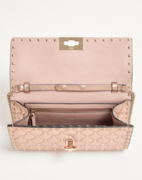 Valentino Garavani Rockstud Spike chain crossbody bag in laminated nappa leather. Quilted construction embellished with small platinum-finish studs. Equipped with a detachable chain strap, this accessory can be worn as a crossbody/shoulder bag or carried by hand. - Quilted leather. Rhombus pattern enhanced by tone-on-tone stitching - Platinum-finish metal studs and hardware - Flap with swivel closure - Nappa leather lining. Interior: zipper pocket and 8 card slots - Dimensions: W23xH113.5xD4.5 cm / W9.1xH5.3xD1.8 in. - Made in Italy Product code: 8W2B0137IEW_GF9