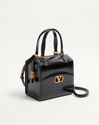Valentino Garavani Vain-Case bowling bag in shiny calfskin with metallic VLogo Signature detail. The bag may be handheld using the convenient handle or worn crossbody by using the adjustable and removable leather shoulder strap. - Hardware in antique gold finish - Zipper closure - Side twist padlock closure - Protective feet - Nappa leather lining. Interior: slip pocket with zipper - Shoulder strap drop length: 55 cm / 21.7 in. at the center hole - Dimensions: W19.5xH19xD13 cm / W7.7xH7.5xD5.1 in. - Made in Italy Product code: 7W0B0S31TAK_0NO
