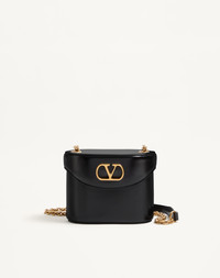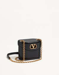 Valentino Garavani Vain vanity bag in shiny calfskin with metallic VLogo Signature detail. The bag can be carried by hand using the handle or worn crossbody using the chain, both of which are detachable. - Hardware in antique gold tone finish - Magnetic closure with VLogo in antique brass finish - Nappa lining. Interior: slip pocket - Chain drop length: 55 cm / 21.7 in.; handle drop length: 12 cm / 4.7 in. - Dimensions: W16xH13xD8.5 cm / W6.3xH5.1xD3.3 in. - Made in Italy This product contains magnets. Please consider if this product will be worn within 15 cm from any implanted device. Any concerns please contact your healthcare professional. Product code: 7W2B0R95GCB_0NO