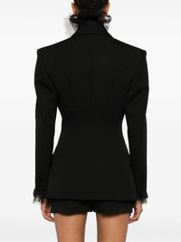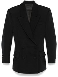 tailored virgin wool blazer Highlights - Valentino ready to wear - Black - Virgin wool - Grain de poudre - Tailored design - Double-breasted button fastening - Peak lapels - Chest welt pocket - Shoulder pads - Long sleeves - Buttoned cuffs - Two side flap pockets - Full lining - Straight hem Made in Italy Composition Outer: Virgin Wool 100%, Wool 58%, Viscose 42% Lining: Cupro 100% SIZE & FIT Model measurements Height 5 ft 10 in(1.77 m) Bust/Chest 33.07 in(84 cm) Hips 37 in(94 cm) Waist 24.8 in(63 cm) FittingInformation Designed for a slim fit that sits just away from the body offering a close yet comfortable fit The internal shoulder pads offer a structured shape Made from a midweight non-stretch fabric