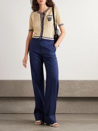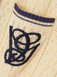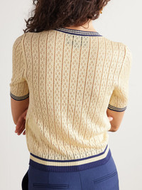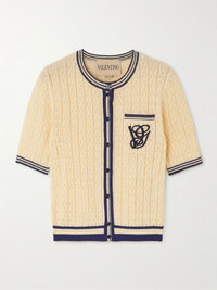 Valentino Garavani's cardigan is pointelle-knitted from a breathable linen-blend with a dainty pattern. It's designed for a slightly loose fit defined by contrasting stripes and features the signature 'VG' monogram embroidered at the chest - a nod to the founder’s legacy of elegance and craftsmanship. Size & Fit - Fits true to size, take your normal size - Designed for a slightly loose fit - Lightweight, open knit - Model is 175cm/ 5'9" and is wearing a size Small Model measurements: - Bust: 85cm/ 33.5” - Waist: 63cm/ 25” - Hip: 90cm/ 35.5” Details & Care - Cream and navy linen-blend - Button fastenings through front - 54% linen, 46% viscose - Dry clean