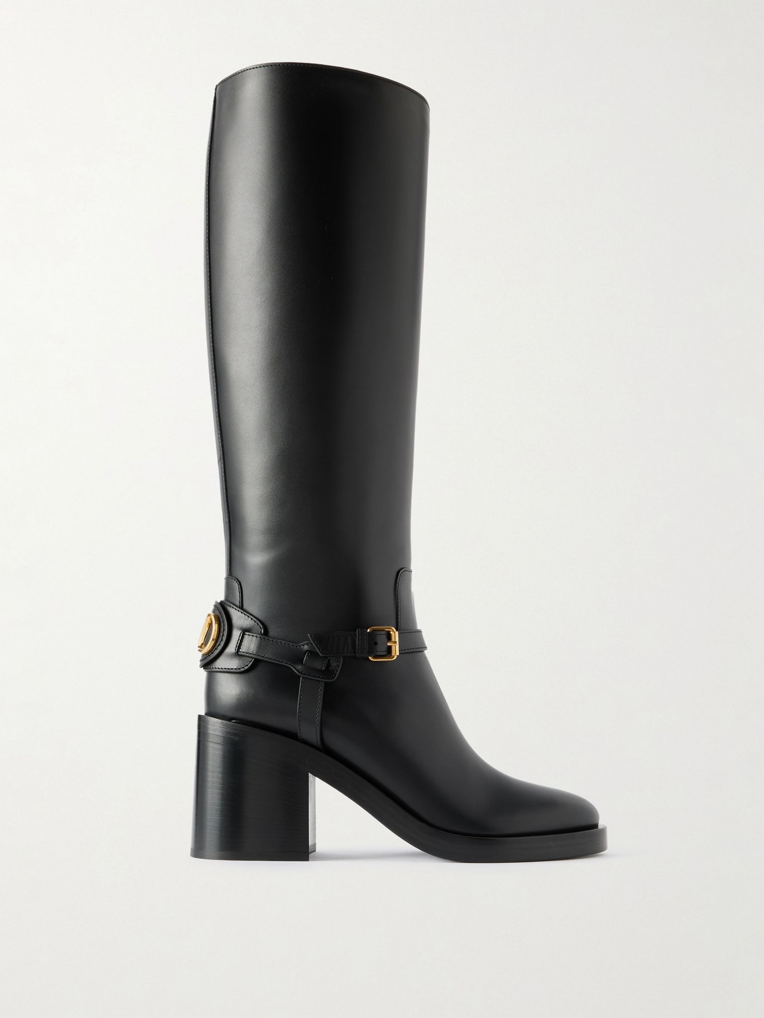 Valentino Garavani's knee boots nod to equestrian riding styles, and are elevated by gold-tone hardware. Made in Italy from smooth leather, they have harness-like straps at the ankle featuring the 'VLogo' and an adjustable buckle. The block heels offer 80mm of manageable lift. Size & Fit - Fits true to size, take your normal size - Italian sizing Details & Care - Heel measures approximately 80mm/ 3 inches - Black leather (Calf) - Pull on