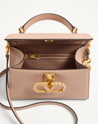 Valentino Garavani VSLING small handbag in grainy calfskin leather with VLogo Signature jewel closure. The bag can be worn on the shoulder/crossbody by using the extendable shoulder strap, or handheld thanks to the handle. - Antique brass-finish hardware - Magnetic closure embellished with synthetic pearls and Swarovski® crystals - Leather shoulder strap with adjustable chain detail - Protective feet - Nappa leather lining. Interior: one zipper pocket Shoulder strap drop length: min. 45 cm to max. 59 cm / min. 17.7 in. to max. 23.2 in. - Dimensions: W22xH17xD9 cm / W8.7xH6.7xD3.5 in. - Made in Italy This product contains magnets. Please consider if this product will be worn within 15 cm from any implanted device. Any concerns please contact your healthcare professional. Product code: 7W2B0F53XPW_DYF