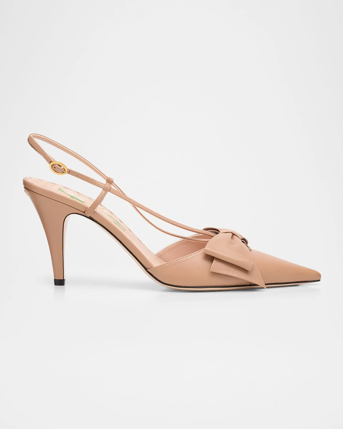 Adorned with a statement bow, the "Bowow" pumps by Valentino Garavani are crafted from smooth goatskin leather with a thin, crossover vamp strap silhouette 3.25 in / 85 mm stiletto heel Pointed toe Buckle slingback strap VLogo hardware at heel Leather lining and outsole Made in Italy