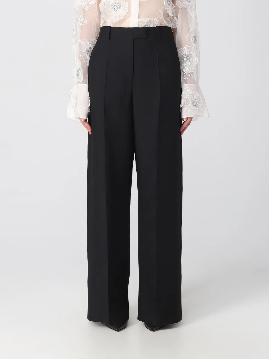 DESCRIPTION - Style: Classic - Model: Palazzo - Pockets: America , Back slit pocket - Waist: High waist - Bottom: With straight hemline - Closure: With button and zip - Materials: Silk blend, Wool blend - Pattern: Plain-colored DETAILS AND CARE Composition SE035%WV065% SIZE AND FIT Sizes not available Size and fit Slim fit Designer code: 3B3RB5D01CF 0NO Giglio Code: 392618 Designer: Valentino Collection: Valentino Woman Category: Clothing Valentino