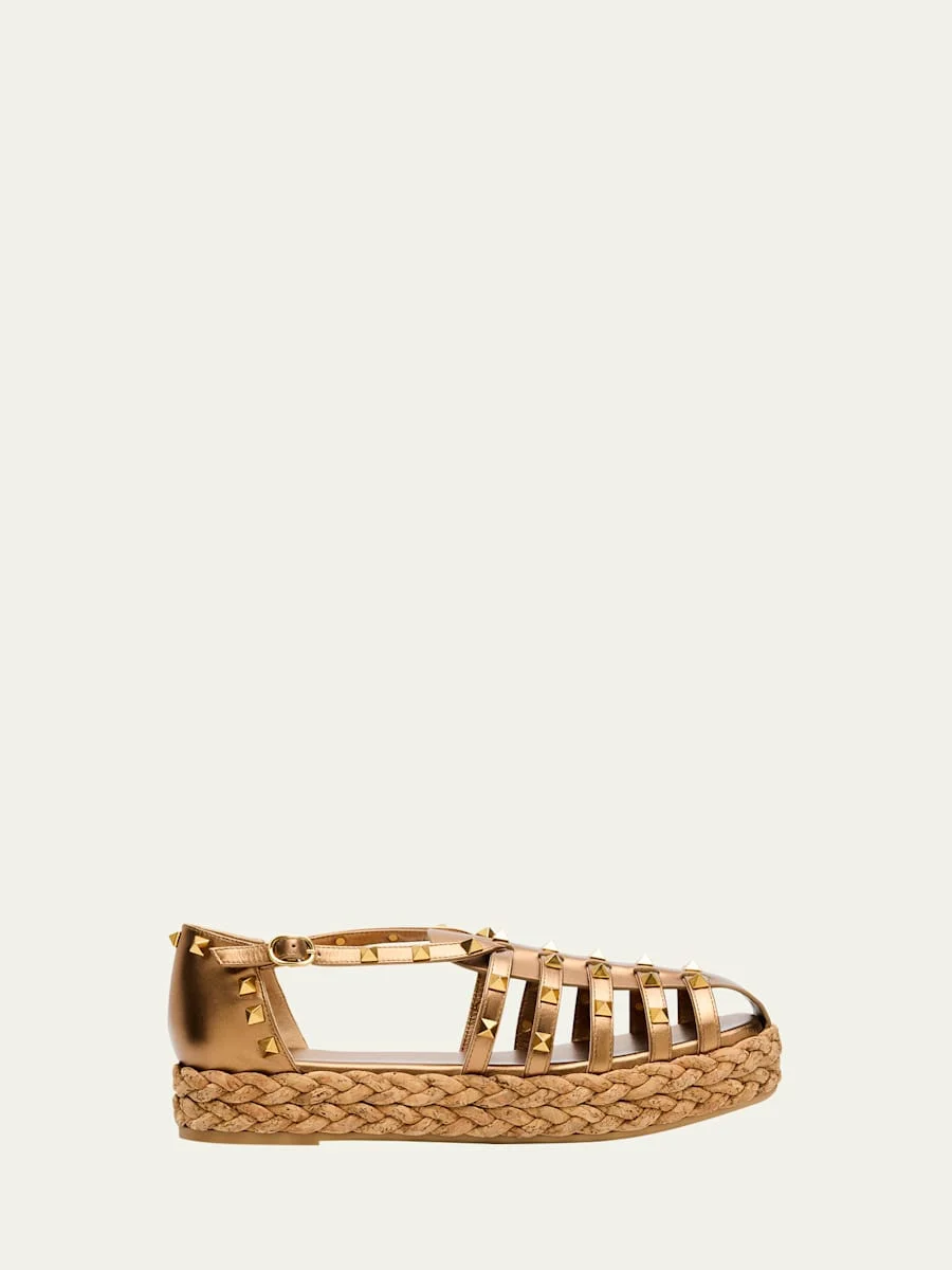 Valentino Garavani metallic leather espadrille fisherman sandals with Rockstud trim 1.25 in / 30 mm braided cork flatform heel Round toe Caged vamp Adjustable ankle strap Polyurethane outsole Lining: Goat leather Made in Italy