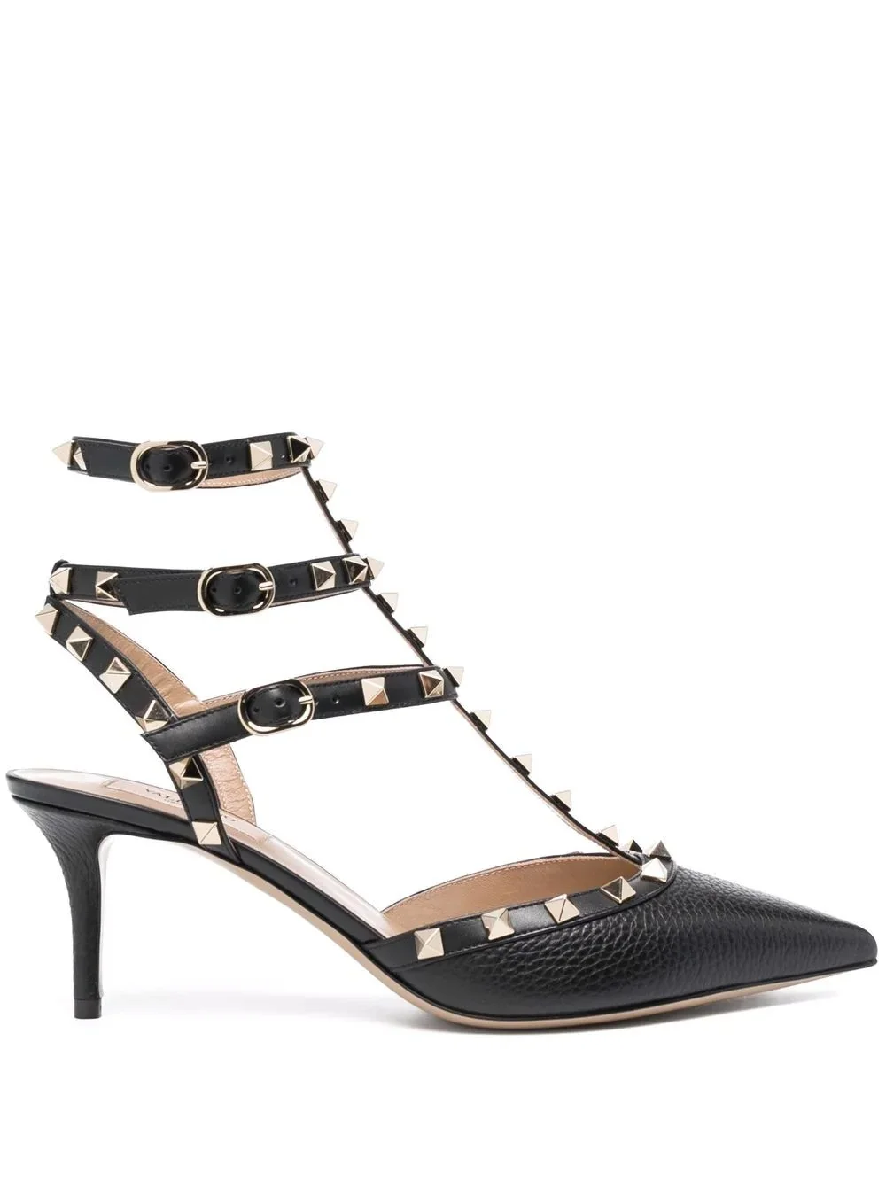65mm Rockstud caged pumps Valentino Garavani first introduced its signature Rockstuds in 2010. Inspired by Roman architectural designs, the city where the Italian powerhouse was founded, they adorn a classic caged design for a bold finishing touch. Highlights - Black - Leather - Pointed toe - Branded insole - Tonal stitching - Caged design - Gold-tone rockstud embellishment - Side buckle fastening - Adjustable straps - 65mm mid heel Made in Italy Composition Outer: Calf Leather 100%, Metal 100% Sole: Calf Leather 100% Lining: Goat Skin 100% SIZE & FIT Measurement HEEL 2.55 in(6.5 cm) Washing instructions Read Manufacturer Guidelines