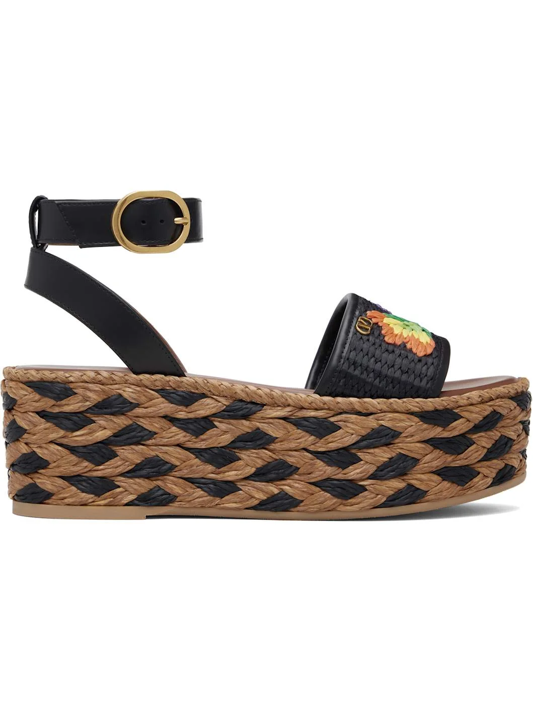 Buffed leather and woven faux-straw platform sandals. · Open toe · Logo hardware and floral embroidery at vamp · Pin-buckle ankle strap · Logo stamp at leather footbed · Braided faux-straw platform midsole · Treaded rubber sole · Platform: H2.75" Supplier color: Black/Black/Tobacco Upper: leather, textile. Sole: rubber. Made in Spain 252807F124014