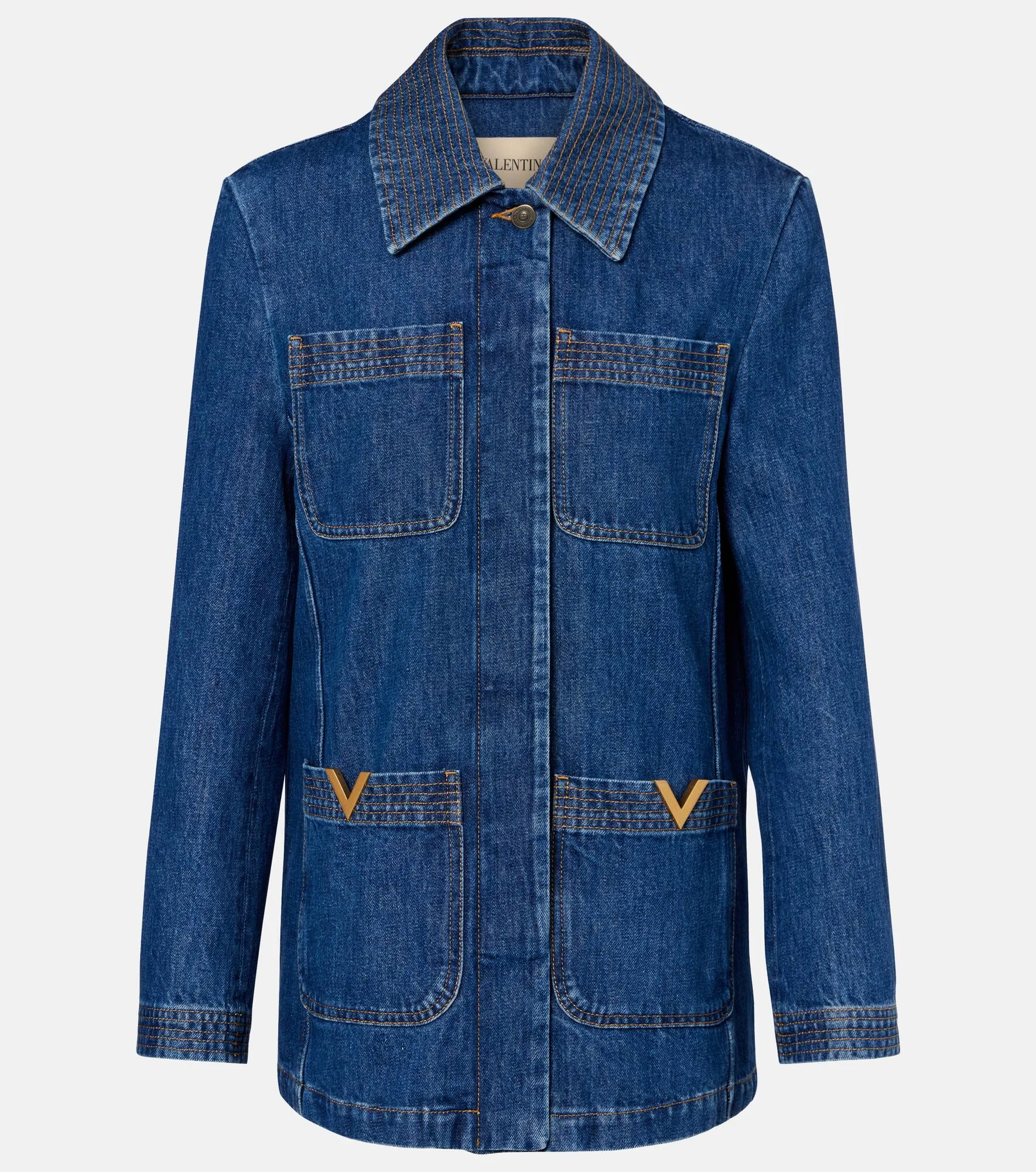 At once iconic and understated, Valentino's VGold carries the Maison's legacy of elegance. The unmistakable logo is featured on this field jacket, made from blue denim with contrasting stitching and a concealed buttoned front. Product Details - Material: 100% cotton - Care instructions: machine wash at 30 degrees - Made in Italy - Color: blue - Designer color name: Medium Blue Denim - Closure: concealed button placket - Pockets: rounded chest pockets, patch pockets - Item number: P01107859 Size & Fit - True to size - Straight fit - Non-stretchy fabric - Falls below the hip - Height of model is 174cm-68.5" and wears a size IT 40