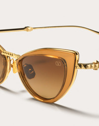 VIII - Cat-eye Titanium and Acetate Stud Frame. Originated by an oneiric landscape, permeated by grace and inclusivity, the VALENTINO EYEWEAR COLLECTION reaffirms the choice of authenticity and the maison’s Couture legacy, throughout the Japanese craftsmanship. FEATURES - Cat-eye frame in crystal brown Japanese acetate and light yellow gold titanium. - Titanium temple with studs and tridimensional stud temple tip. RFID chip on left bottom temple tip. - Ceramic metal-plated nose pads with VLogo and beta-titanium nose pads arms. - VLogo lasered dark to light brown 4-base lens, high contrast CR-39. - 100% UV Protection. - Prescription friendly. - Woman Sunglasses. - Handcrafted in Japan. PACKAGING - Recycled leather case with strap and cleaning cloth. MEASUREMENTS - Temples lenght: 14.2 cm / 5.6 in - Frame total width: 14.7 cm / 5.7 in - Lens Width: 5 cm / 1.9 in - Lens Height: 3.3 cm / 1.3 in - Bridge: 1.8 cm / 0.7 in Product code: Z500VLS102B_7S5