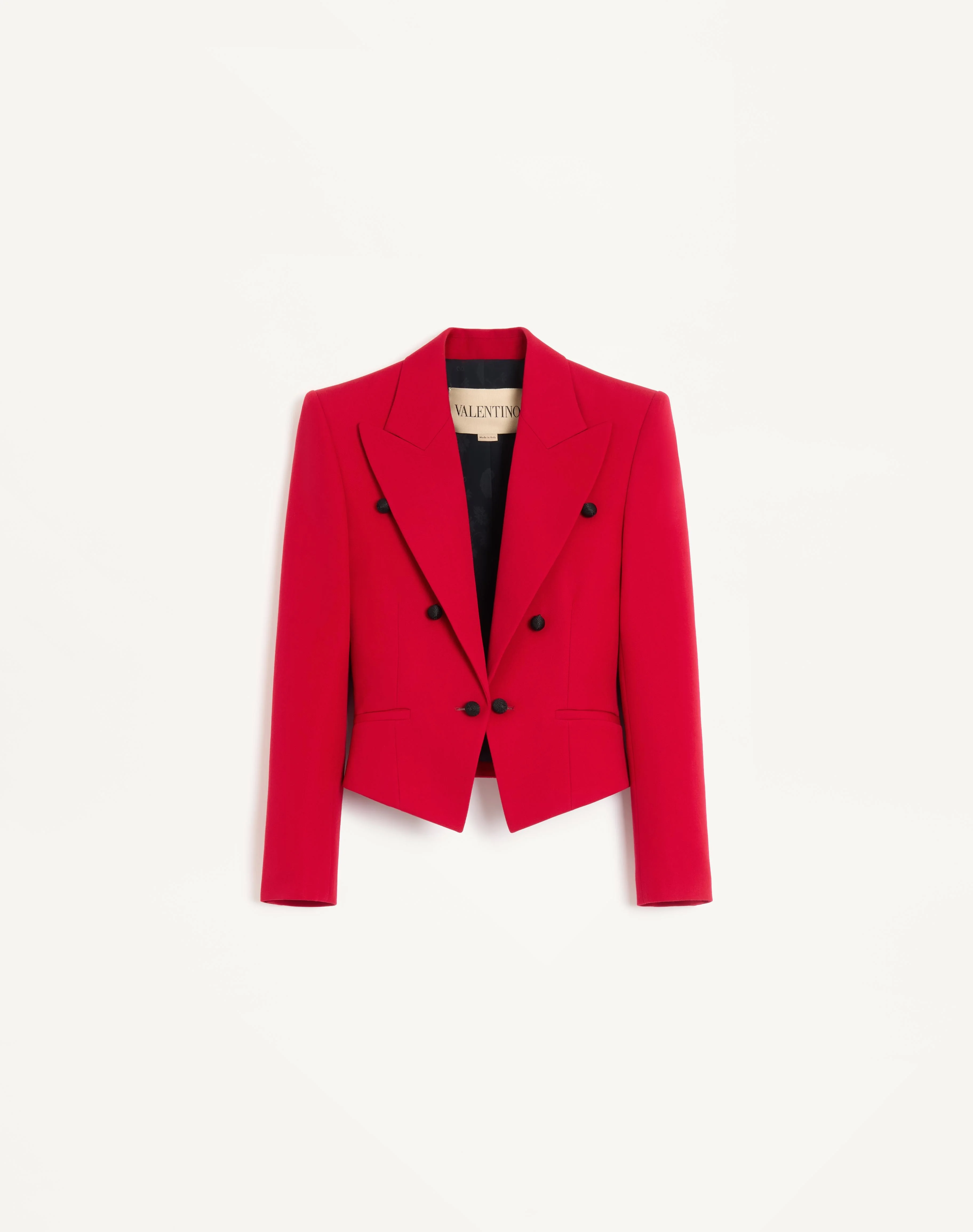 Virgin Wool Jacket - Front closure with soutache buttons - Shoulder pads - Virgin Wool (100% Virgin Wool) - VLogo Flower Jacquard Lining (75% Acetate, 25% Silk) - Length: 49 cm / 19.3 in. from the shoulders in an Italian size 40 - The model is 176 cm / 5'9" tall and wears an Italian size 40 - Made in Italy The look of the model is completed by a Valentino Garavani Viva Superstar Bag and Valentino Garavani Hotty Shoes. Product code: 8B3CE58597W_R9M