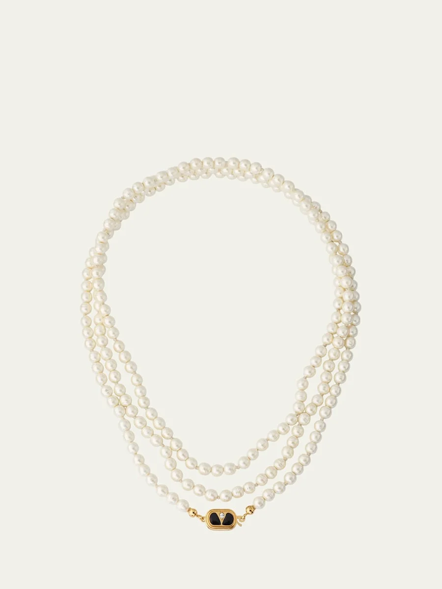 Valentino Garavani layered necklace with stationed VLOGO crystal Naturallyhued natural Akoya pearls Goldtone metal Hook clasp closure Made in Italy