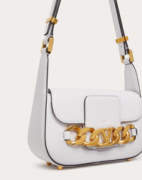 Valentino Garavani VLogo Chain small shoulder bag in calfskin leather. Metal chain featuring VLogo Signature element. - Antique brass-finish metal hardware - Magnetic closure - Adjustable leather shoulder strap - Protective feet - Nappa leather lining. Interior: slip pocket Shoulder strap drop length: 34 cm / 13.3 in. - Dimensions: W27xH15xD8 cm / W10.6xH5.9xD3.1 in. - Weight: 0.42 Kg / 0.9 lb - Made in Italy Product Code WB0K81ZHF_001
