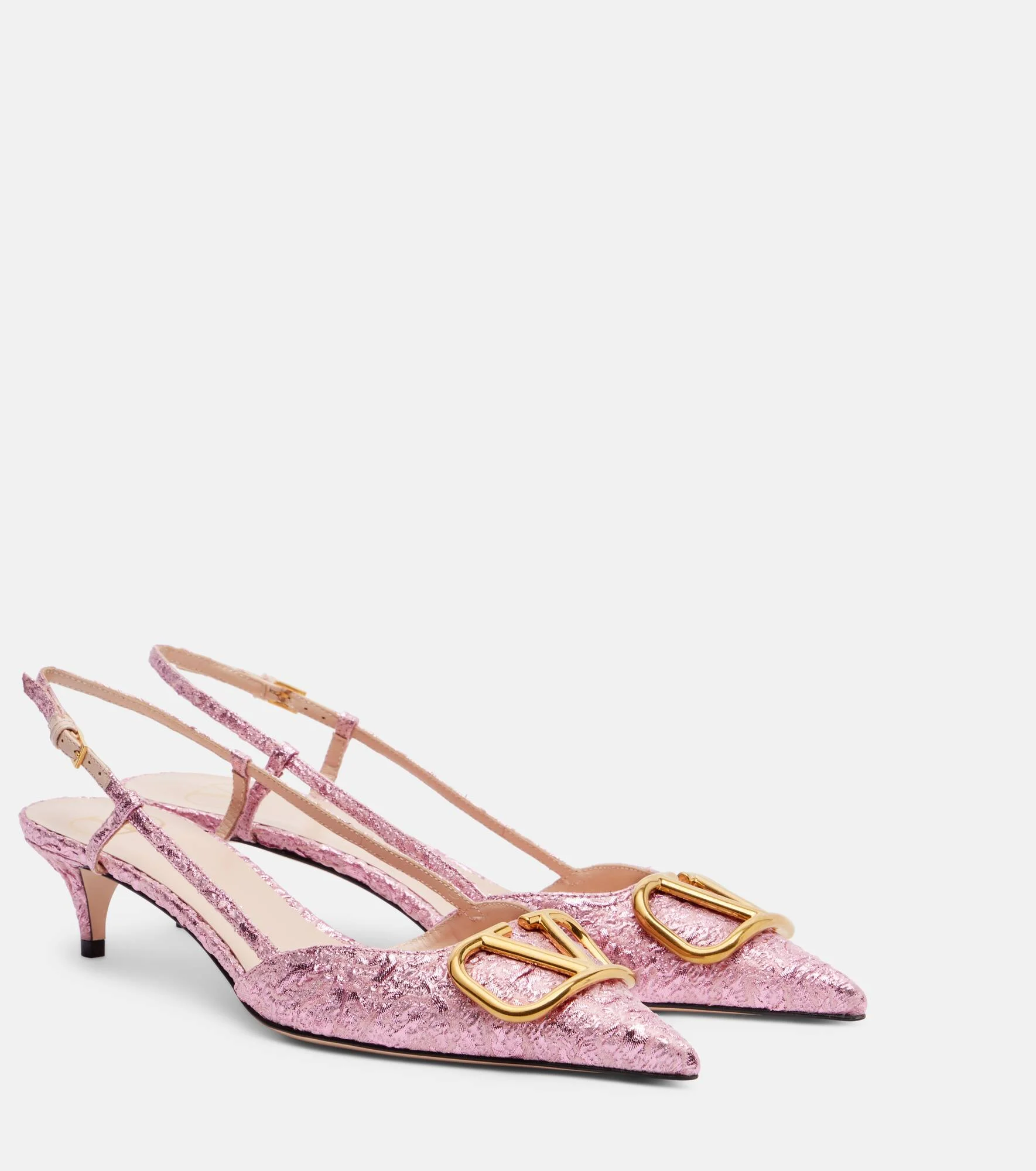 At once iconic and understated, Valentino Garavani's VLogo carries the Maison's legacy of elegance. The beloved code is featured front and center on the vamps of these delicate slingback pumps, crafted from cloque jacquard. Product Details - Upper: fabric - Lining: leather - Sole: leather insole, leather and rubber sole - Color: pink - Toe shape: pointed toe - Made in Italy - Includes: shoe box, dust bag - Designer color name: Rosa - Item color: pink - Hardware color: gold - Slingback strap - Closure: buckle fastening - Item number: P01130510 Size & Fit - Fits slightly large to size - we recommend trying a half size smaller - European sizes - 4cm-1.5" heel