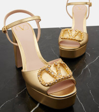 Step in style with these sandals from Valentino Garavani. Crafted in Italy from gold-hued metallic leather, the elegant pair features round open-toe silhouettes with shimmering crystal embellishments and the house's signature VLogo hardware. Product Details - Upper: leather - Lining: leather - Sole: leather insole and sole - Toe shape: round open toe - Made in Italy - Includes: shoe box, dust bag - Designer color name: Antique Brass Light/Crystal - Item color: gold - Hardware color: gold - Closure: buckle fastening - Item number: P01130502 Size & Fit - True to size - For narrow feet, we recommend trying a half size smaller - European sizes - 11,5cm-4.5" heel (size EU 38) - 3,5cm-1.5" platform (size EU 38)