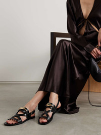 EDITORS'NOTES Valentino Garavani's sandals are topped with a chunky version of the label's signature 'VLOGO' embellishment. Modeled after classic gladiator styles, they're made from supple leather and have adjustable slingback straps. SIZE & FIT - Fits true to size, take your normal size - Italian sizing DETAILS & CARE - Heel measures approximately 15mm/ 0.5 inches - Black leather (Calf) - Buckle-fastening ankle strap