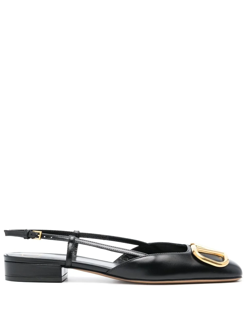 VLogo leather slingback ballerina shoes Showcasing Valentino Garavani's refined glamour, these slingback ballerina shoes are defined by the signature VLogo plaque. Made in Italy, the leather pair has a contemporary square toe and a buckle-fastening slingback. Highlights - Black - Calf leather - Maxi vlogo signature - Branded footbed - Square toe - Buckle-fastening slingback strap - Low stacked heel Made in Italy Composition Outer: Calf Leather 100% Lining: Calf Leather 100% Sole: Calf Leather 100% SIZE & FIT Measurement HEEL 0.78 in(2 cm)