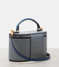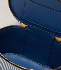 At once iconic and understated, Valentino Garavani's VLogo carries the Maison's legacy of elegance. Crafted from leather with a striped motif, the signature symbol is featured on the front of this Mini vanity bag. Product Details - Material: leather - Lining: leather - Made in Italy - Color: blue - Designer color name: Bright Marine/Butter White - Hardware color: gold - Top handle, Detachable, adjustable shoulder strap - Internal details: card slot - Includes: box, dust bag - Closure: two-way zipped top - Item number: P01127161 Size & Fit - Height 10,5cm-4" - Max. width 17,5cm-7" - Depth 8,5cm-3.5" - Length of handle 18cm-7" - Adjustable shoulder strap - Min. length shoulder strap 127cm-50" - Max. length shoulder strap 117cm-46"
