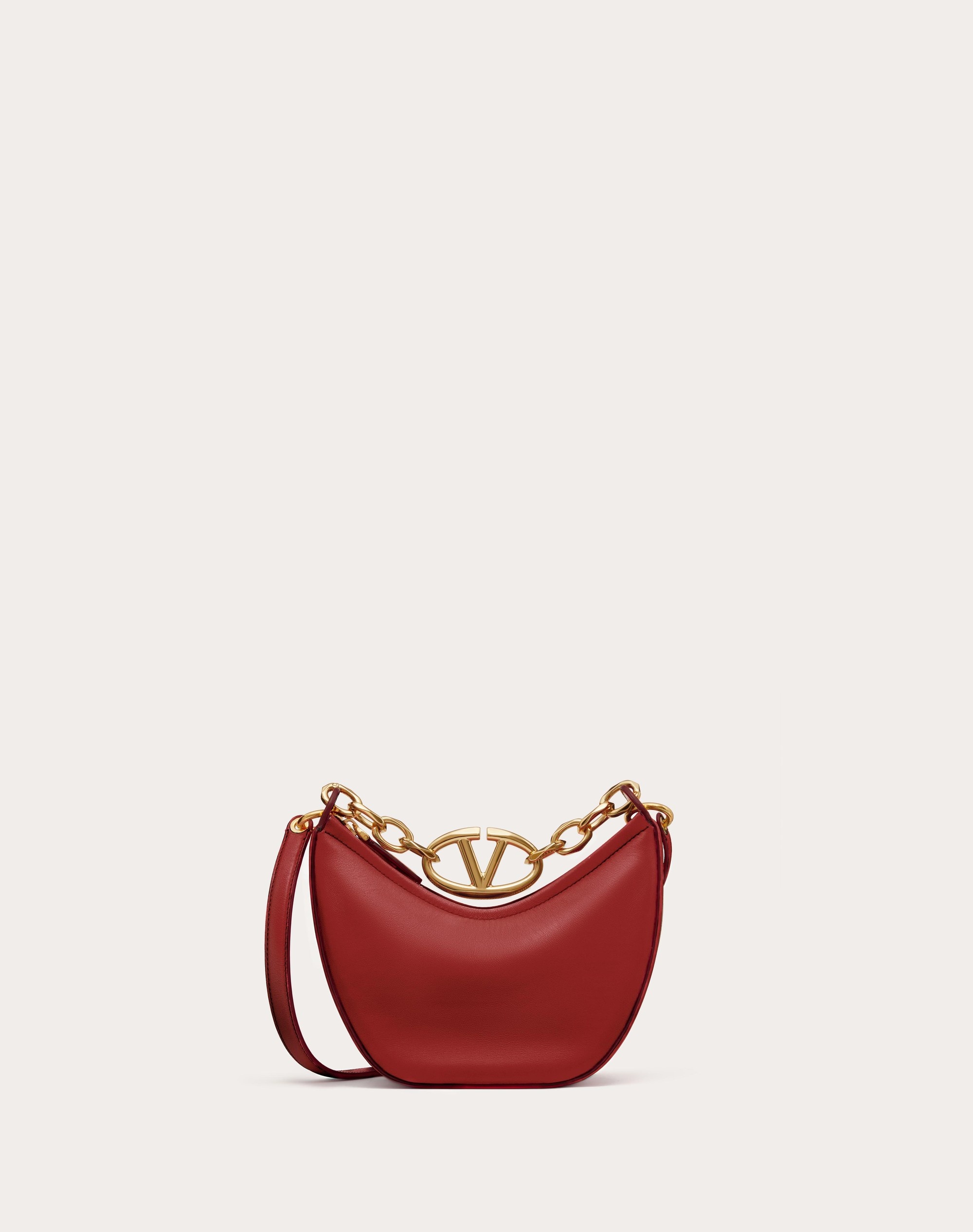 Valentino Garavani VLogo Moon Mini Hobo Bag in nappa leather featuring chain with metallic VLogo Signature detail. The bag can be worn as a crossbody bag or handbag thanks to the chain and removable leather shoulder strap. - Gold-finish chain and hardware - Removable leather shoulder strap - Zipper closure - Nappa leather lining. Interior: one slip pocket - Shoulder strap drop length: 58 cm / 22.8 in. - Chain drop length: 12.5 cm / 4.9 in. - Dimensions: W20xH23xD8 cm / W7.9xH9.1xD3.1 in. - Made in Italy Product code: 4W0B0N46PHV_0RO