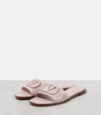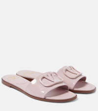 At once iconic and understated, Valentino Garavani's VLogo carries the Maison's legacy of elegance. It features on these glossy slides, crafted from patent leather in a soothing pastel hue. Product Details - Upper: leather - Lining: leather - Sole: leather insole, rubber sole - Toe shape: round open toe - Made in Italy - Includes: shoe box, dust bags - Designer color name: Water Rose - Hardware color: silver - Item number: P01000656 Size & Fit - True to size - Best fit for narrow feet - European sizes - 1,5cm-0.5" heel (size EU 38)