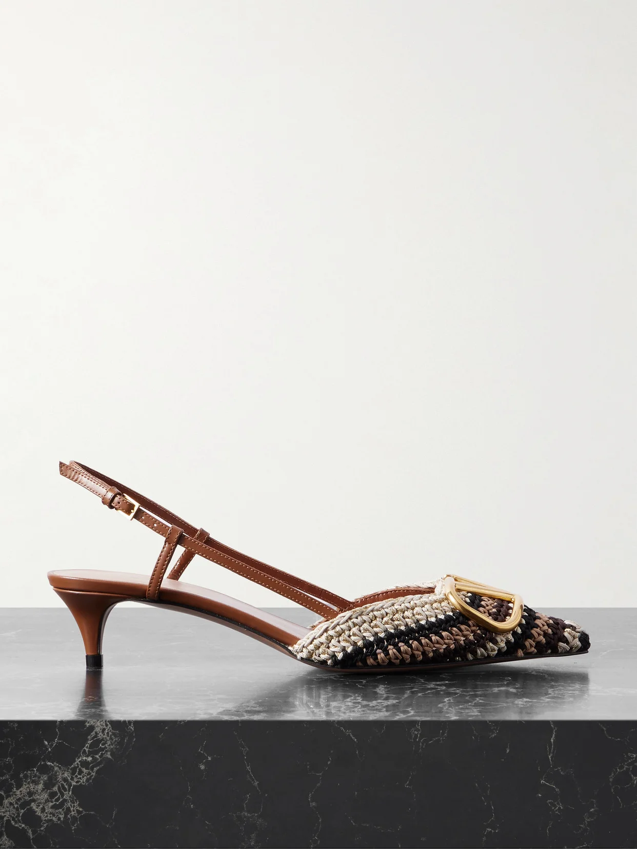 Valentino Garavani's pumps are intricately crocheted with neutral stripes and shimmering metallic threads. They're designed in a sleek point-toe shape and have adjustable leather slingback straps and the gold-tone 'VLogo' embellishment. The manageable heel offers 45mm of lift.