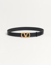 Valentino Garavani VLogo Signature belt in shiny calfskin with crystals. - Vlogo Signature buckle in antique brass finish with Swarovski® crystals - Shiny calfskin exterior - Calfskin interior - Dimensions: H.30 mm / 1.18 in. - Made in Italy Product code: 6W2T0SM9GBI_EDM