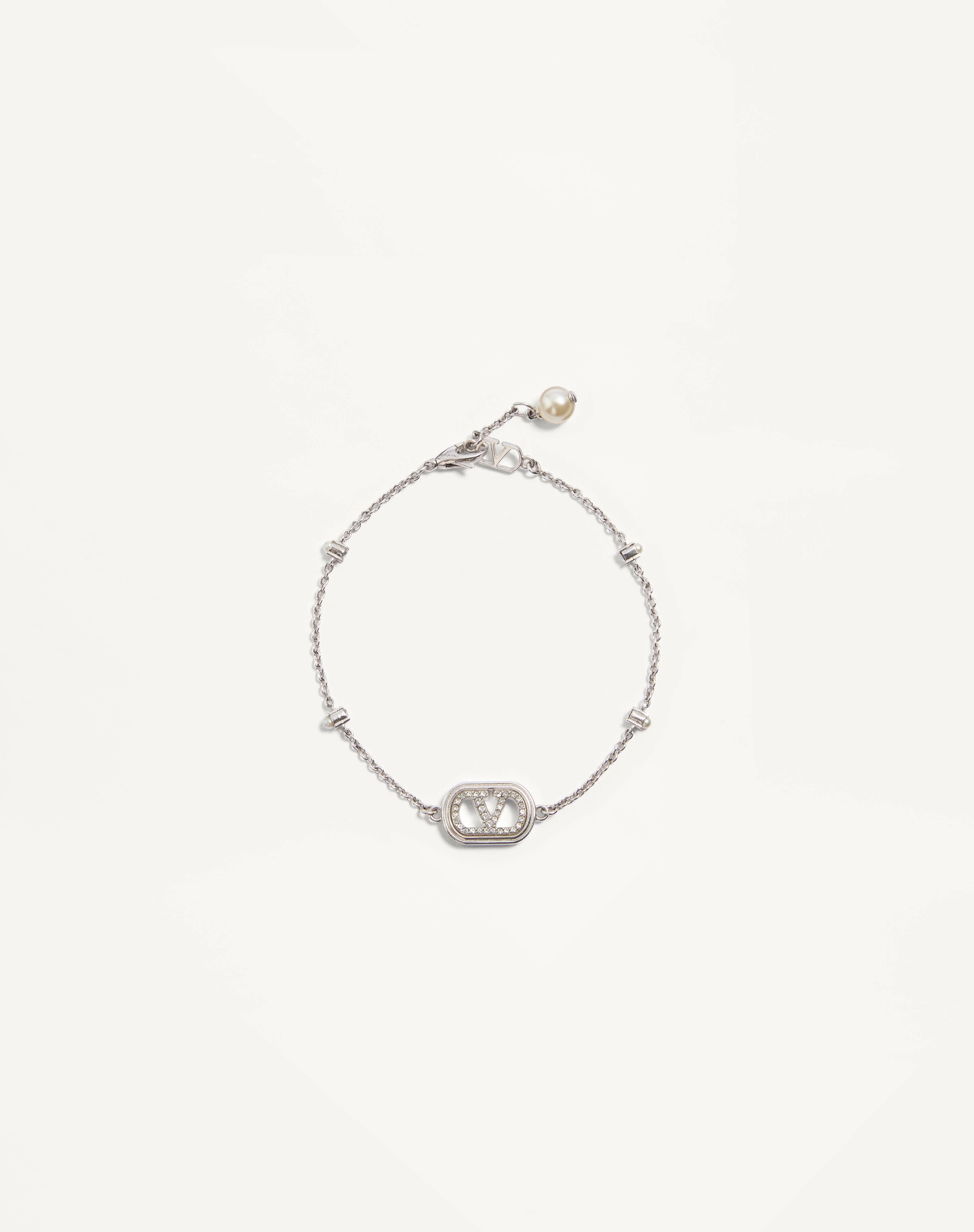 VLogo Signature Bracelet in Metal, Pearls, and Swarovski® Crystals - Rhodium-tone finish - Chain with pearl and Swarovski® crystal details - Available in sizes S - M - Size S adjustable length from 16 to 18 cm / 6.3 to 7.1 in. - Size M adjustable length from 18 to 20 cm / 7.1 to 7.9 in. - Swivel clasp closure with Swarovski® pearl tip - Made in Italy Product code: 7W2J0AG0WKD_DFF