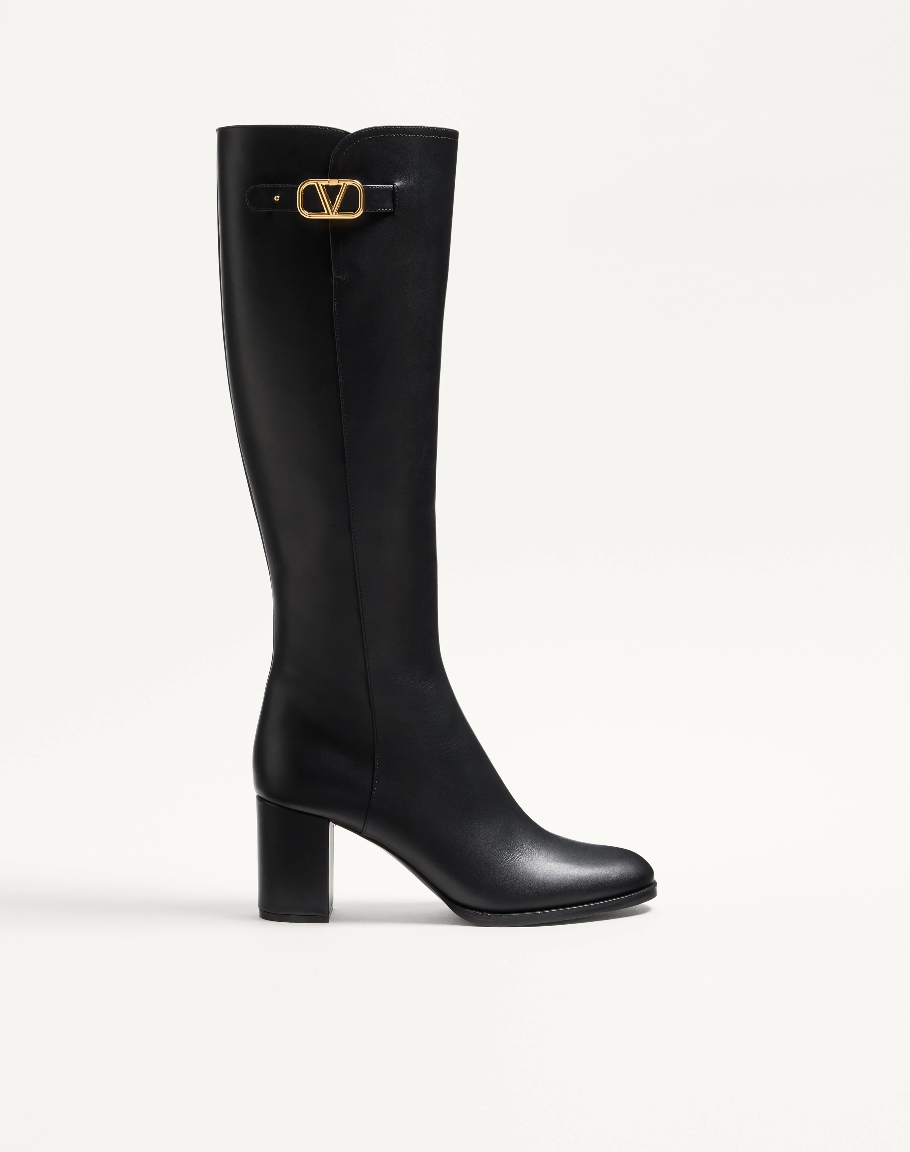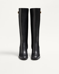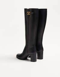 Valentino Garavani calfskin boot with VLogo Signature decoration -Antique brass-effect VLogo Signature accessory - Side zipper fastening - Leather sole with non-slip rubber half sole - Leather-covered block heel - Heel height 70 mm / 2.7 in. - Shaft height 39 cm/ 15.4 in. in an Italian size 37 - Made in Italy Product code: 7W2S0HY0DSH_0NO