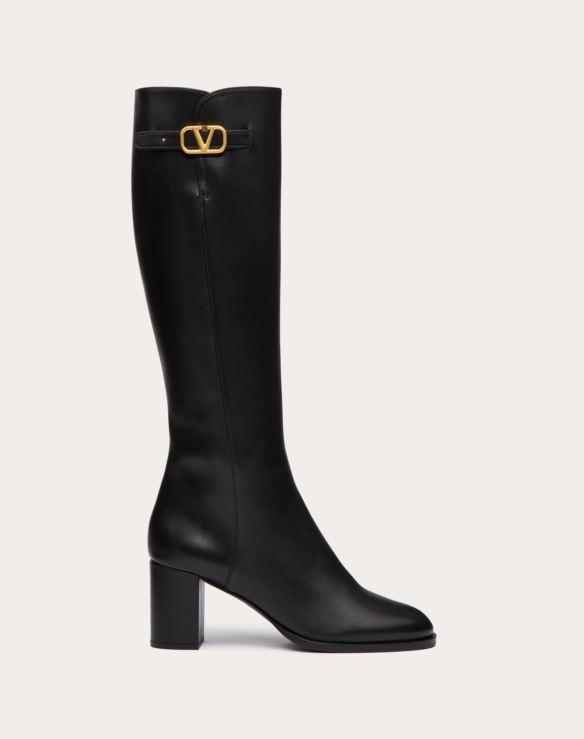 Valentino Garavani calfskin boot with VLogo Signature decoration -Antique brass-effect VLogo Signature accessory - Side zipper fastening - Leather sole with non-slip rubber half sole - Leather-covered block heel - Heel height 70 mm / 2.7 in. - Shaft height 39 cm/ 15.4 in. in an Italian size 37 - Made in Italy Product code: 5W2S0HY0DSH_0NO