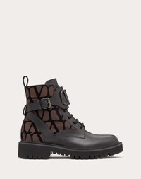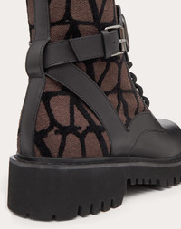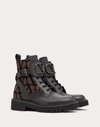 Valentino Garavani combat boot in calfskin leather and Toile Iconographe fabric with VLogo Signature decoration - VLogo Signature accessory with tone-on-tone finish - Rubber lug sole - Heel height: 35 mm / 1.3 in. - Shaft height: 14 cm / 5.5 in. in an Italian size 37 - Made in Italy Product code: 3W2S0Q03HQZ_U02