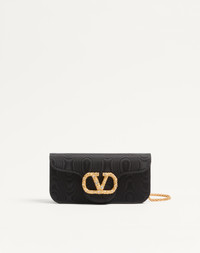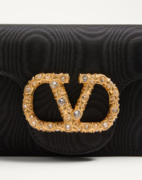 Valentino Garavani Loco clutch in moire fabric with VLogo Signature jewel detail. The bag can be worn on the shoulder/crossbody thanks to the fabric shoulder strap and removable chain. - Antique brass finish metal parts - Magnetic closure decorated with Swarovski® - Adjustable and removable fabric shoulder strap - Shoulder strap with removable chain - Moire fabric lining. Interior: one slip pocket - Shoulder strap drop length: 55 cm / 21.7 in. Dimensions: W21xH10xD5 cm / W8.3xH3.9xD2.0 in. - Made in Italy This product contains magnets. Please consider if this product will be worn within 15 cm from any implanted device. Any concerns please contact your healthcare professional. Product code: 6W2B0R24LDG_EDM