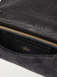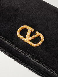 Valentino Garavani's wallet can be worn as a clutch or hanging from the shoulder on an optional chain strap. Drawing on the decadence of antiques, it's made from velvet with braided cord piping, while the interior is lined in moire. The crystals and faux pearls dotting the monogram plaque are a pretty finishing touch. Details & Care - Black velvet - Detachable chain shoulder strap - Internal zipped pocket and card slots - Moire lining - Snap-fastening front flap - Comes with a dust bag
