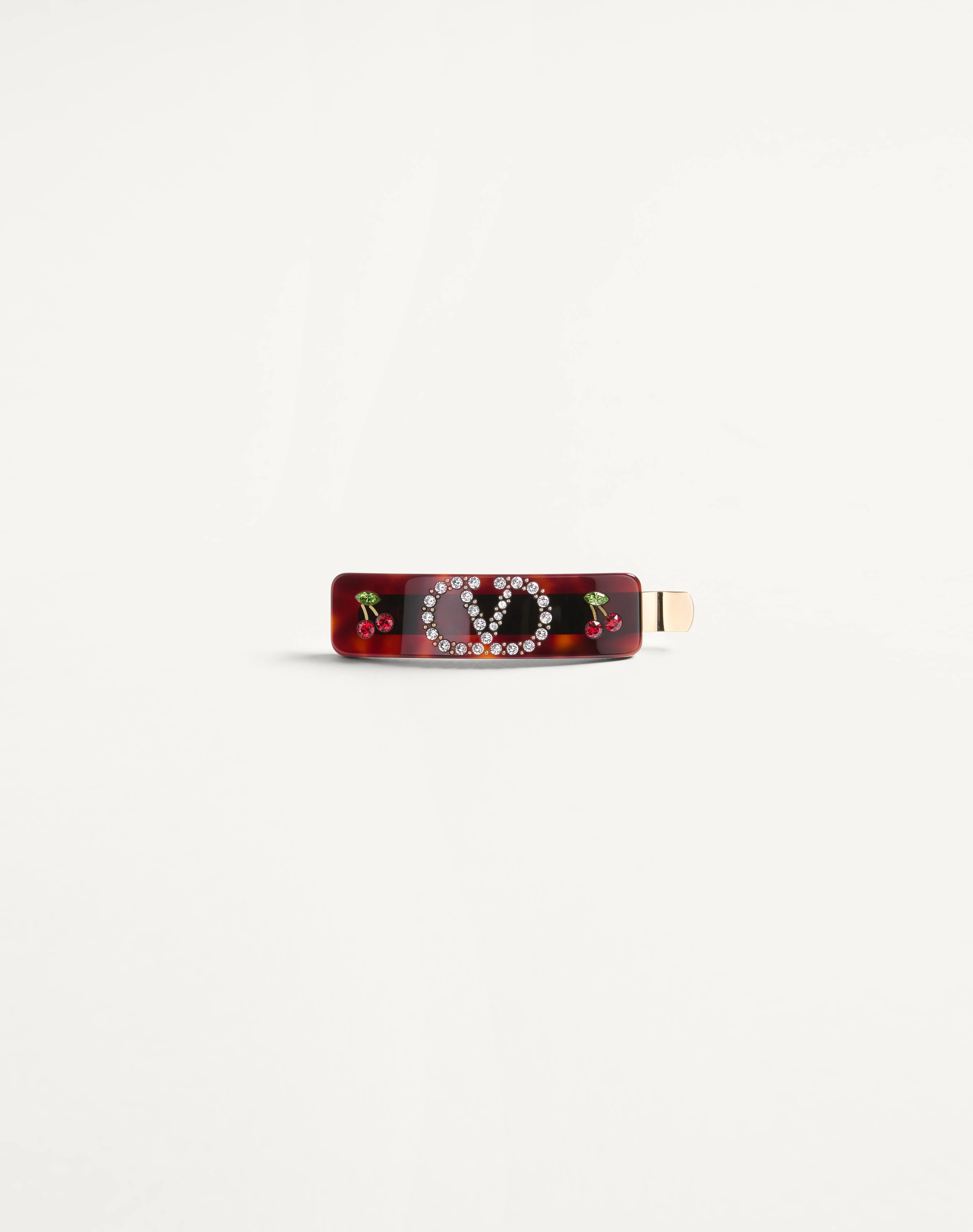 VLogo Signature Hair Clip in Resin, Metal and Swarovski® Crystals - Gold-tone finish - Cherry detail - VLogo detail with Swarovski® crystals and Paris-style applique - Dimensions: 9 x 1.2 cm / 3.5 x 0.5 in. - VLogo Signature dimensions: 3.3 x 2 mm / 0.13 x 0.08 in. - Clasp closure - Made in Italy Product code: 7W2J0AP8LGU_DFQ