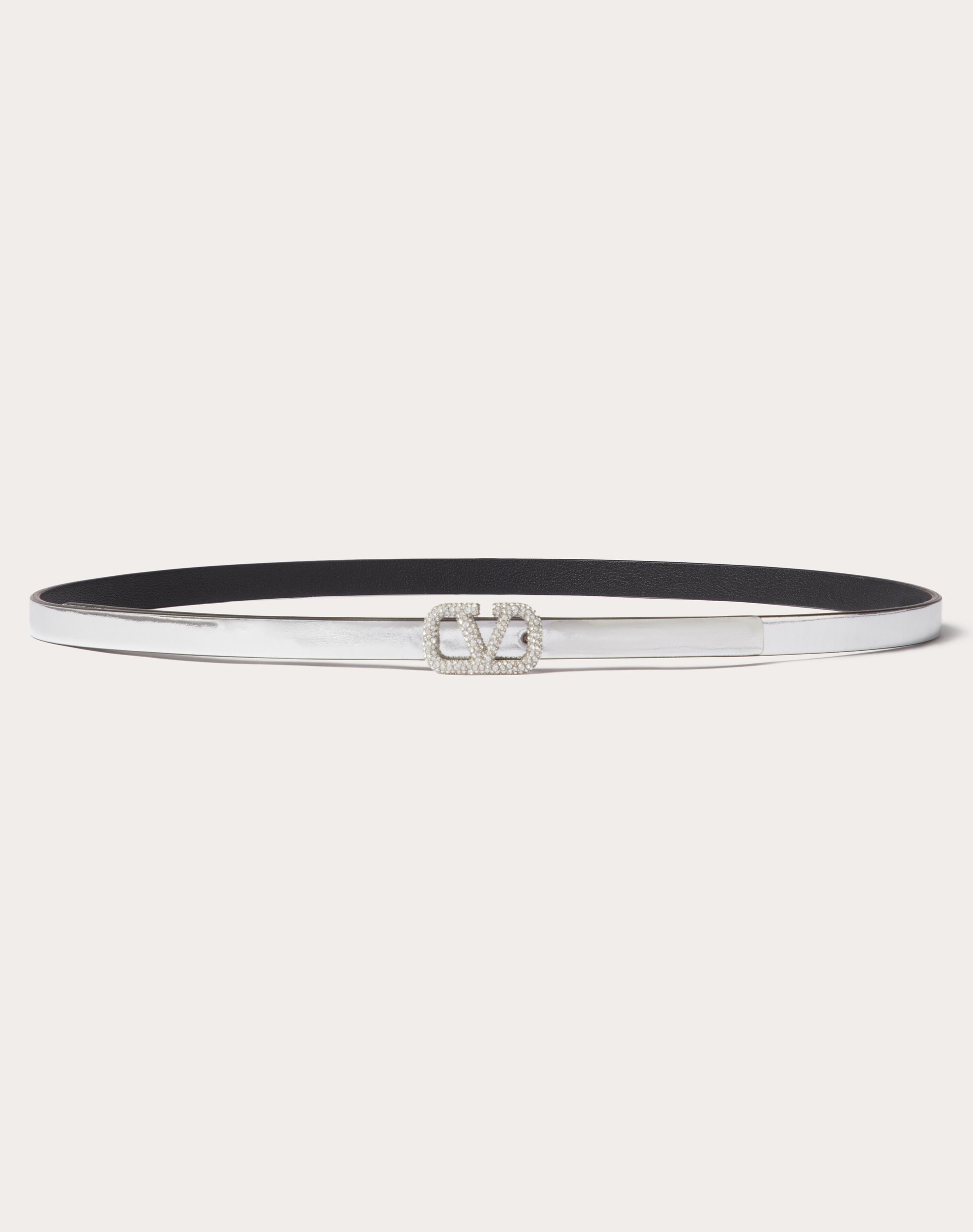 Valentino Garavani VLogo Signature mirror-effect belt. - VLogo Signature buckle adorned with Swarovski® crystals - Mirror-effect exterior - Calfskin interior - Dimensions: H 10 mm / 0. 3 in. - Made in Italy Product code: 3W2T0SB9JFC_GN5