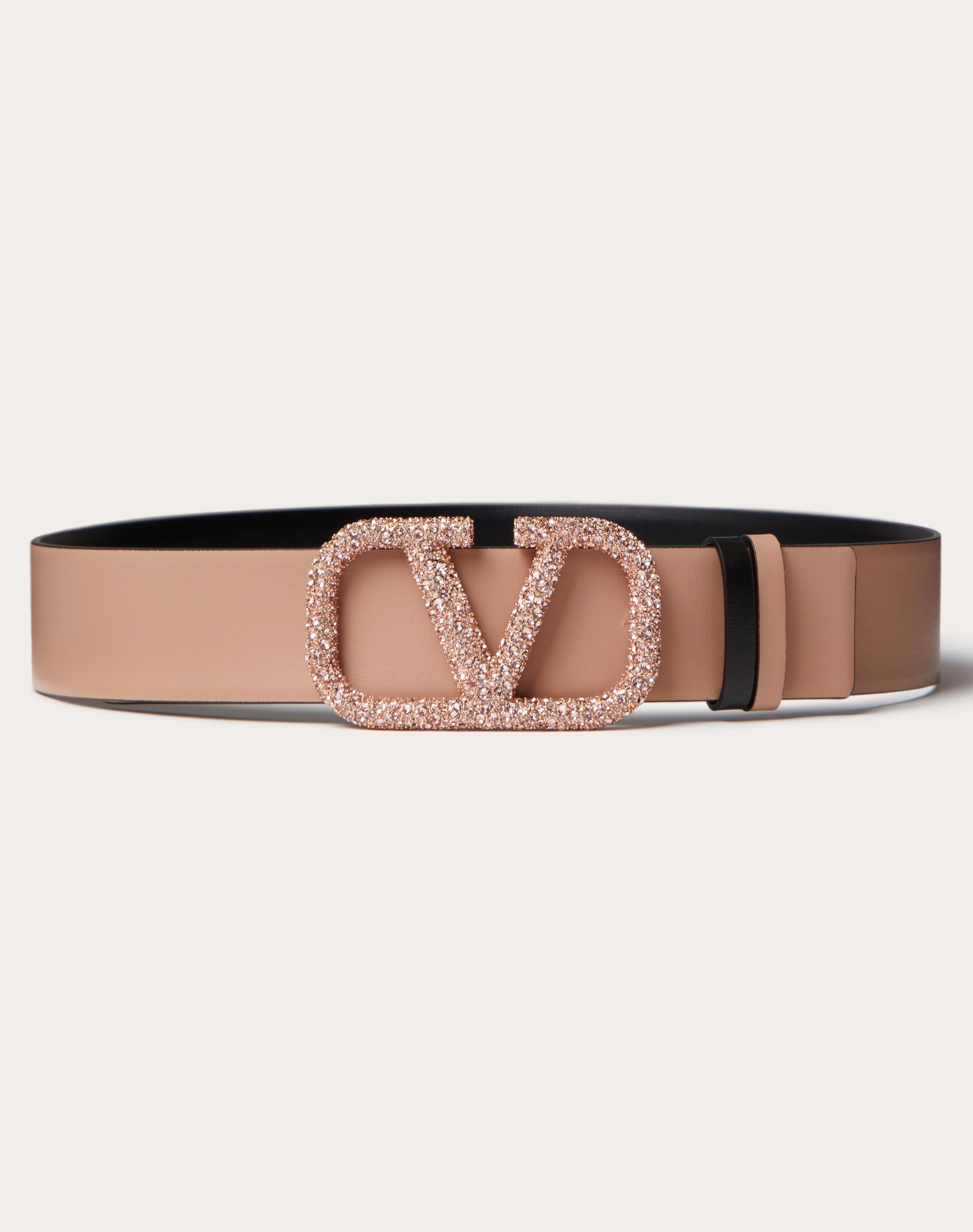 Valentino Garavani VLogo Signature reversible belt in shiny calfskin. - VLogo Signature buckle adorned with Swarovski® crystals - Shiny calfskin exterior - Shiny calfskin interior - Dimensions: H 40 mm / 1.5 in. - Made in Italy Product code: 3W2T0S11GEP_V2X