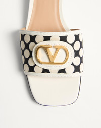 Valentino Garavani Slide Sandal in fabric with Plus De Pois motif, leather details and VLogo Signature decoration - Leather patch with VLogo Signature accessory with antique brass-effect finish - Heel height: 20 mm /0.8 in. - Made in Italy Product code: 7W2S0LT0GHR_A1U