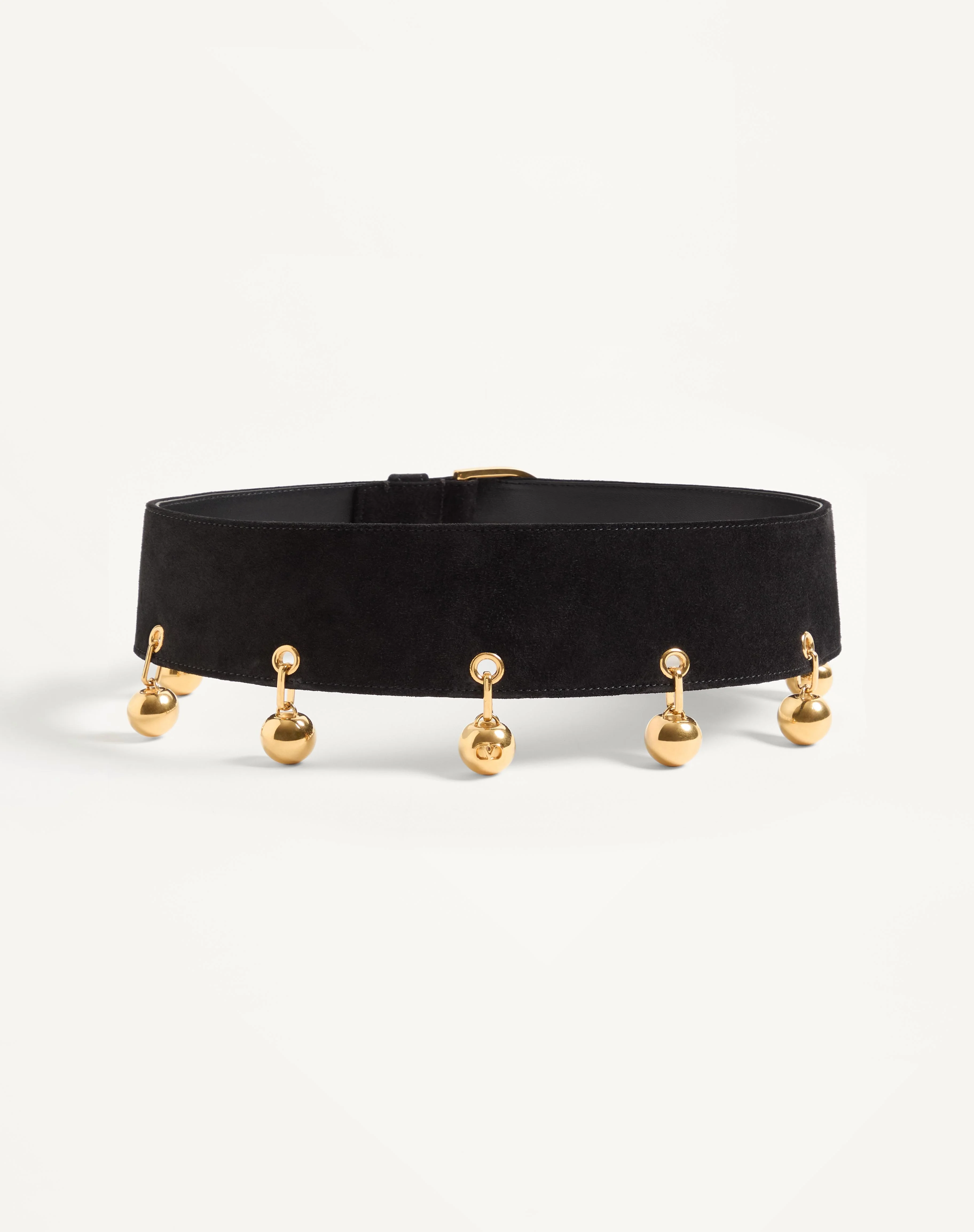 Valentino Garavani VLogo Signature suede belt with decorative metal spheres. - Metal spheres with VLogo Signature detail - Buckle and spheres in antique brass finish - Suede exterior - Nappa interior - Dimensions: H. 65 mm / 2.6 in. - Made in Italy Product code: 7W2T0SR7EWH_0NO