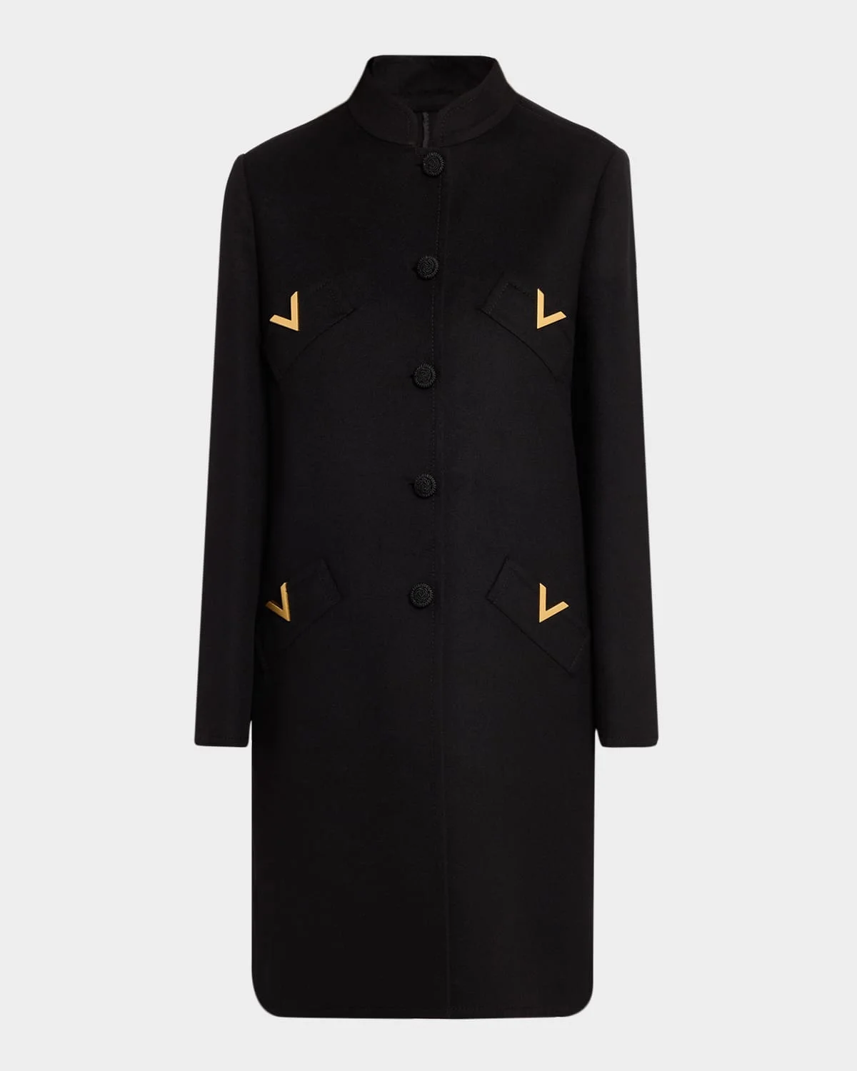 Crafted from compact wool-cashmere, this coat from Valentino Garavani features goldtone V-logo details on the pockets Mandarin collar; single-breasted front Long sleeves Front welt pockets A-line silhouette Hem falls below the hip Button closure Virgin wool/cashmere Made in Italy SIZE & FITModel measurements: 5 & apos;10" tallModel is wearing a US size 4/Small