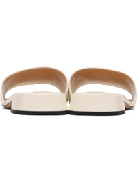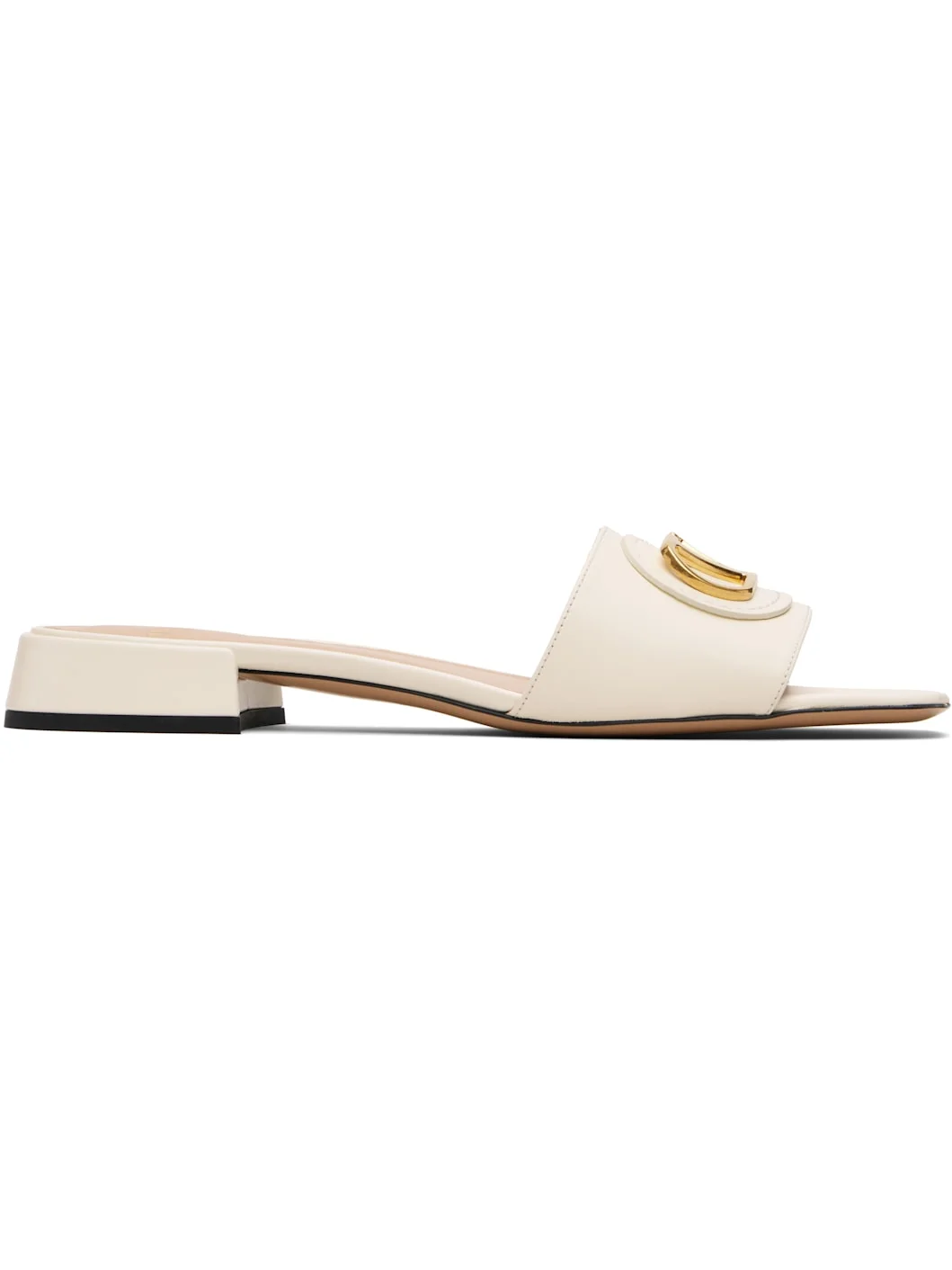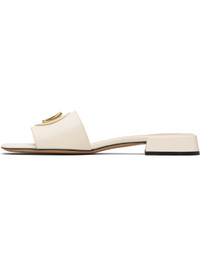 Buffed calfskin flat sandals. · Open square toe · Logo hardware at vamp · Logo embossed at molded leather footbed · Block heel with rubber injection · Leather sole Supplier color: Ivory Upper: calfskin. Sole: leather. Made in Italy 252807F124002