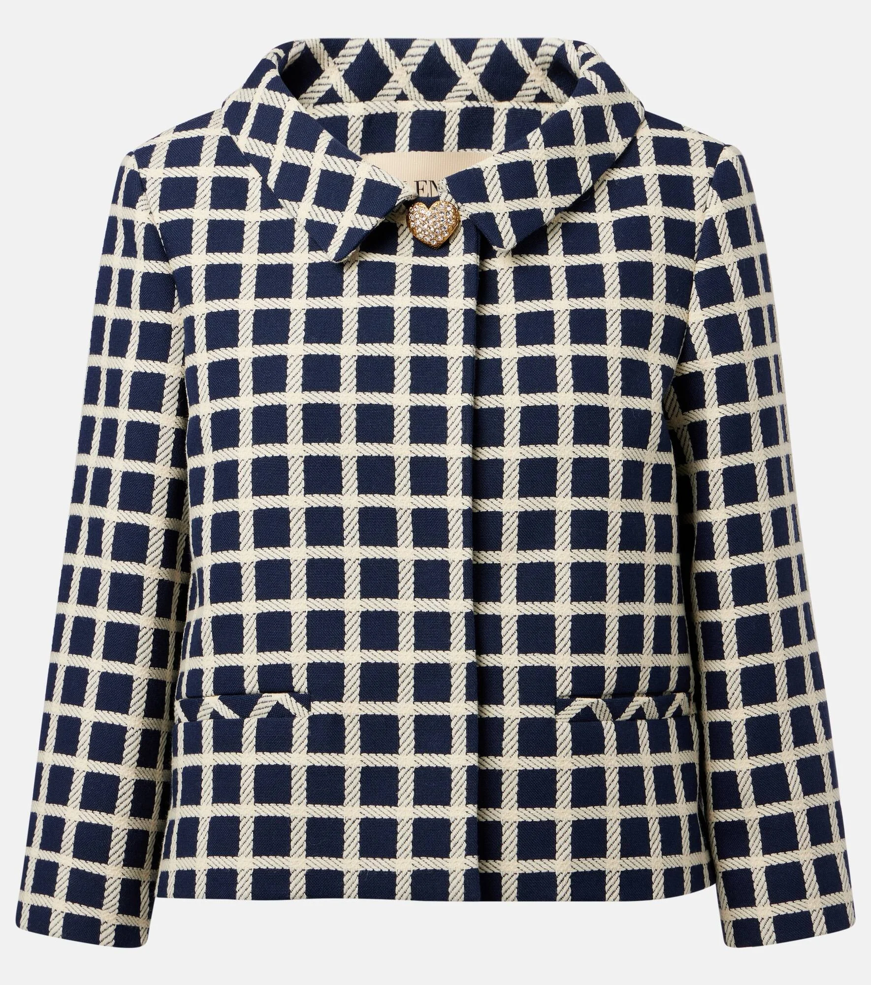 Made from a wool and cotton blend and adorned with a check pattern, this Valentino jacket has a looser fit with slightly cropped sleeves. The design is finished with an embellished heart-shaped button. Product Details - Material: 66% wool, 31% cotton, 3% polyamide - Care instructions: dry clean - Made in Italy - Designer color name: Blu/Beige - Item color: blue - Item number: P01059630 Size & Fit - True to size - Designed for a loose fit - Non-stretchy fabric - Falls to the hip - The model seen in the picture is 178cm-5'10" and wearing a size IT 40