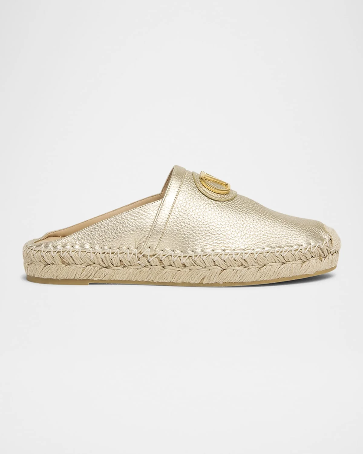 - Valentino Garavani metallic leather espadrille mules featuring a golden V logo medallion - 1.00 in / 25 mm braided-jute flat heel - Round jute-cap toe - Slide style - Rubber outsole - Made in Italy - Size Note: Valentino Garavani shoes run small. Please order a 1/2 size larger than you typically wear.