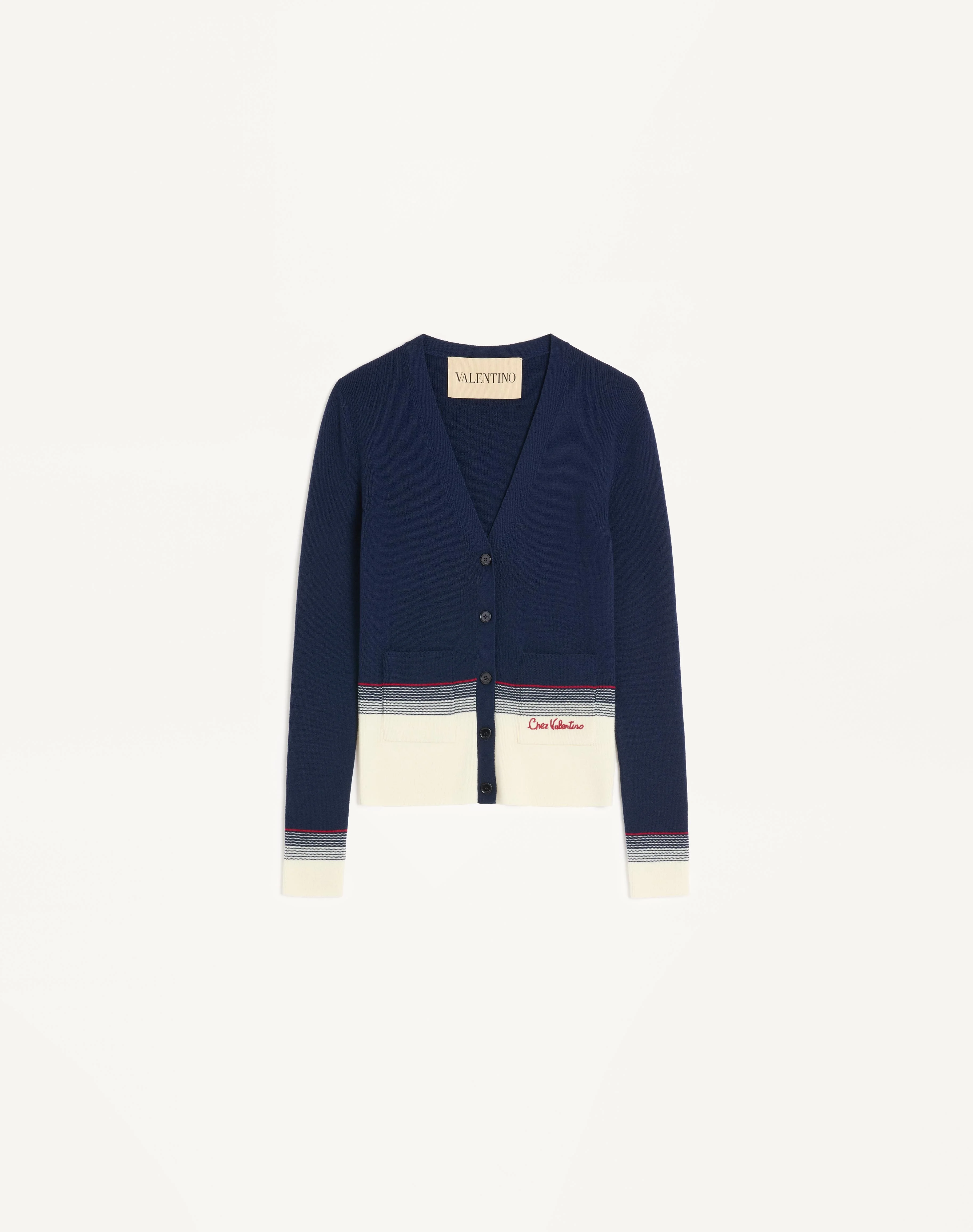 Wool Cardigan with 'Chez Valentino' Embroidery - Front button closure - Wool (100% Virgin Wool) - Length: 60 cm / 23.6 in. from the shoulders in an Italian size S - The model is 176 cm / 5'9" tall and wears an Italian size S - Made in Italy The look of the model is completed by a Valentino Garavani Viva Superstar Bag and Valentino Garavani Fawcette Shoes. Product code: 7B3KA12A9GQ_0W6