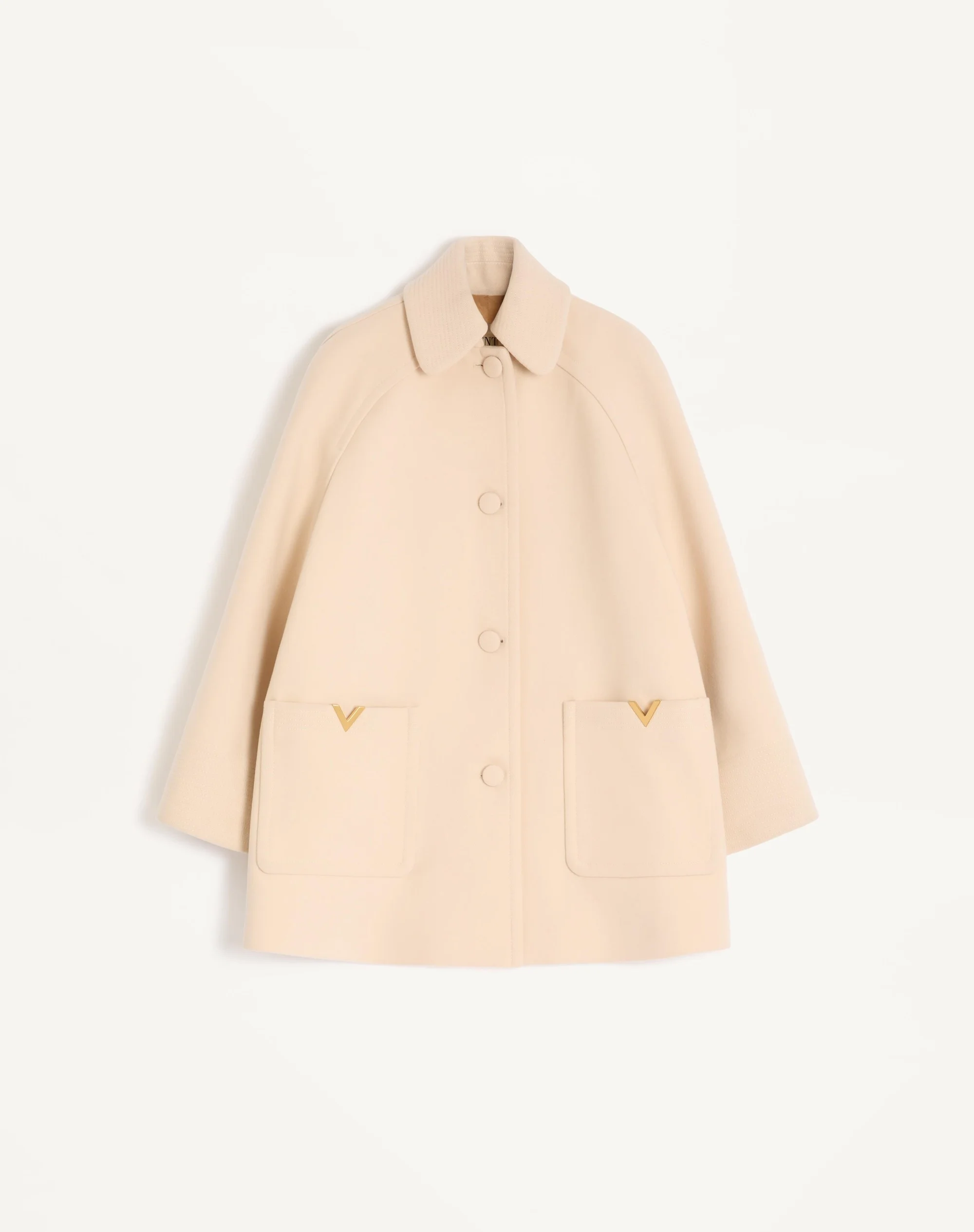 Wool Drap Peacoat with collar - V Gold detail on pockets - Relaxed fit - Front button closure - Wool Drap peacoat (100% Virgin Wool) - Flower, Stripes and VLogo Lining (74% Acetate, 26% Silk) - Length: 85 cm / 33.5 in. from the shoulders in an Italian size 40 - The model is 176 cm / 5'9" tall and wears an Italian size 40 - Made in Italy The look of the model is completed by a Valentino Garavani Hoboho Bag and Valentino Garavani Shoes. Product code: 7B0CA3Z79UK_ET5