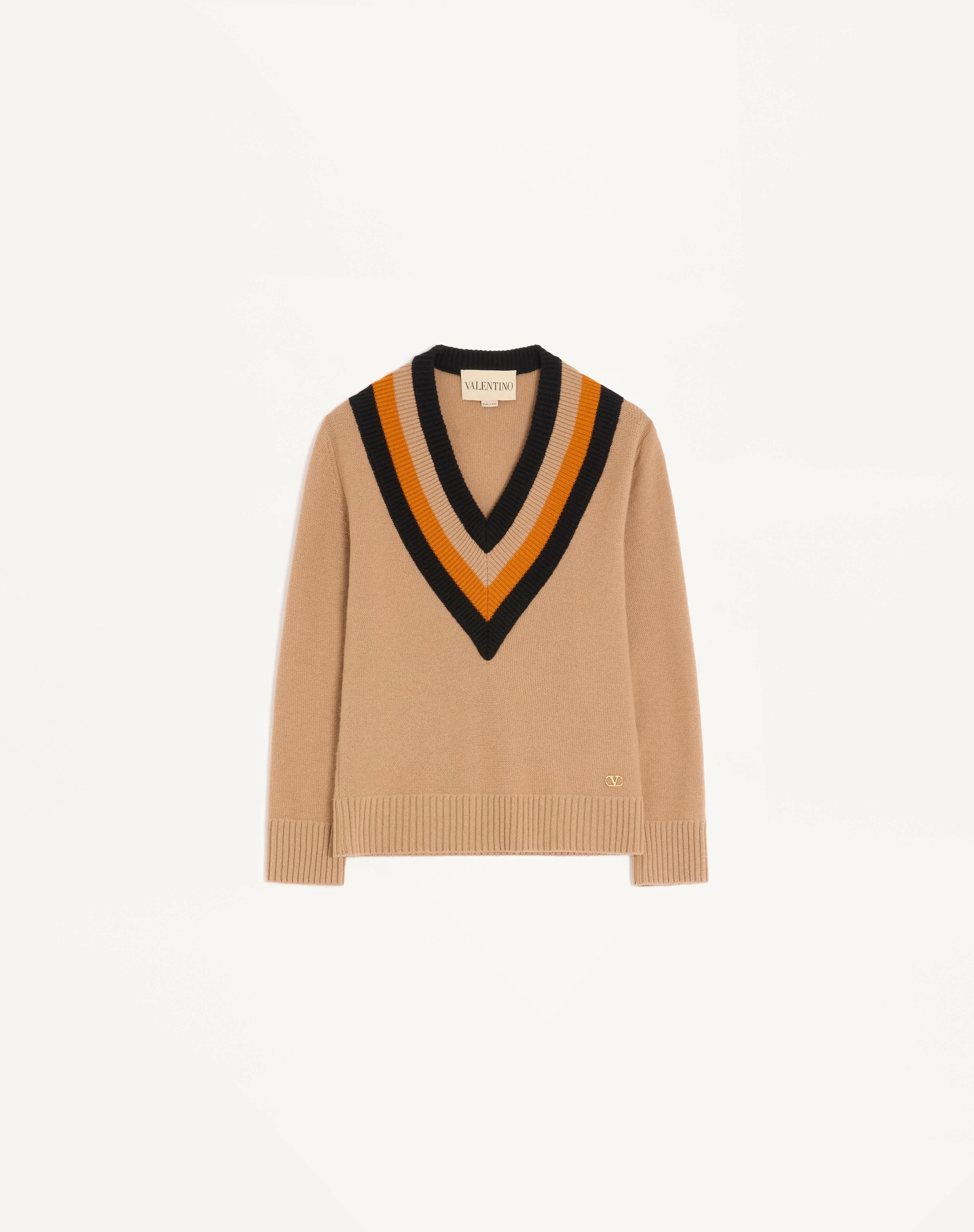 Wool sweater - V neckline - V logo detail - Wool (100% Virgin Wool) - Length: 64 cm / 29.5 in. from the shoulders in an Italian size S - The model is 176 cm / 5'9" tall and wears an Italian size S - Made in Italy The look of the model is completed by a Valentino Garavani Panthea Bag and Valentino Garavani Panthea Shoes. Product code: 7B0KC69L9SW_C54