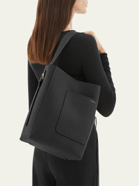 Valextra "Secchiello" bucket bag in calfskin leather Adjustable shoulder strap Open top with hook closure Exterior, front slip pocket Interior, pouch Approx. 12.2"H x 9.1"W x 5.9"D Made in Italy